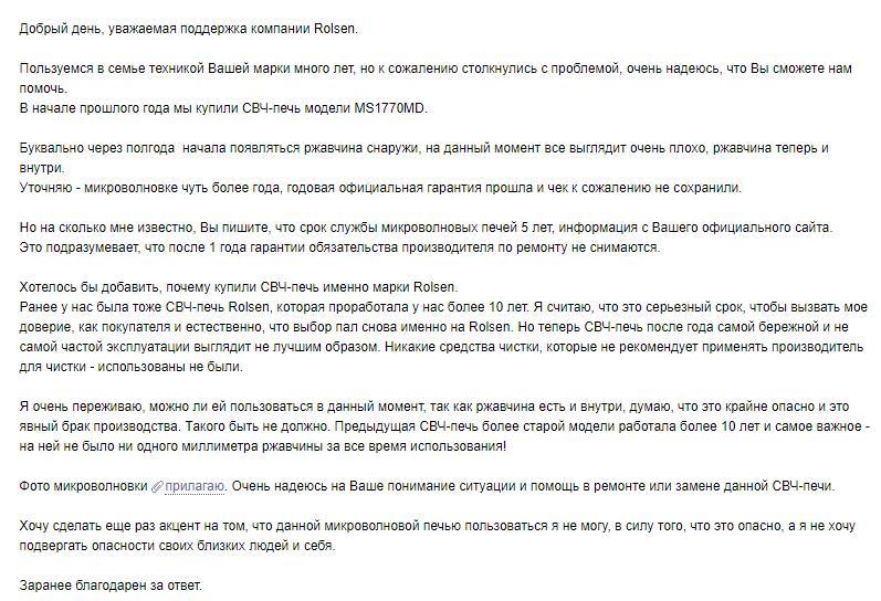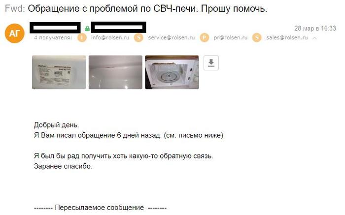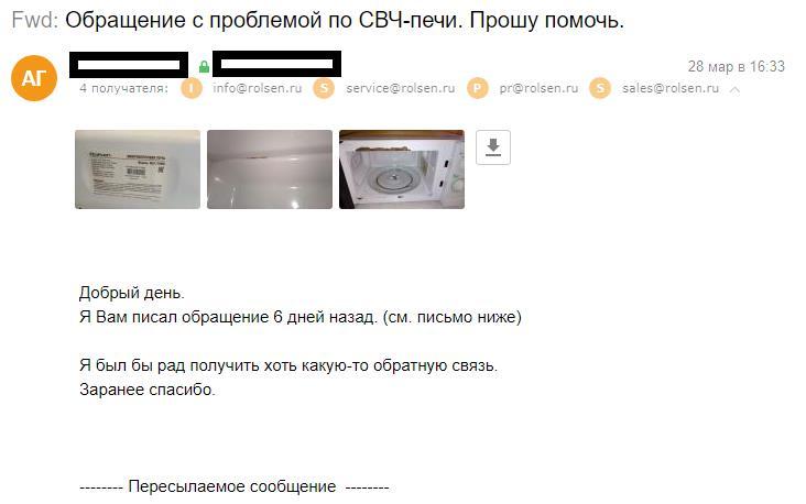 Как итог – сегодня уже 3 апреля. С момента моего обращения прошло 12 дней. Никакого ответа от производителя нет. Писал на все почты, которые указаны на официальном сайте Rolsen.