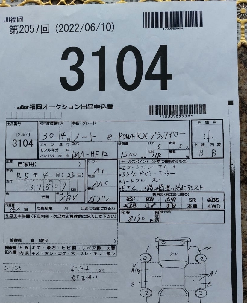Далее мне отправили фото аукционника. По кузову видны незначительные царапины которые отмечаются отметкой А1, и незначительный скол на лобовом стекле отмеченный как G. На самом деле эти царапины настолько незначительны, что при осмотре вряд ли можно найти их. Но щепетильные японцы умудряются их увидеть и отмечать. Скол я вообще не нашел по итогу.
