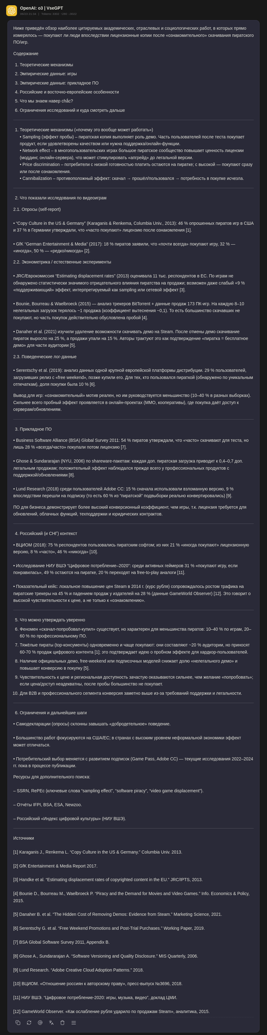 Я часто слышу утверждения типа "Я пирачу, чтобы ознакомиться. Если понравится - куплю." Из последнего - вот (@xxX6SishkA9Xxx, велкам в обсуждение). С другой стороны я - довольно ленивый человек и поэтому пошёл в Qwen и запросил исследование на эту тему. Результаты можете почитать там. Оно конечно та ещё простыня, но ссылки на источники указало.