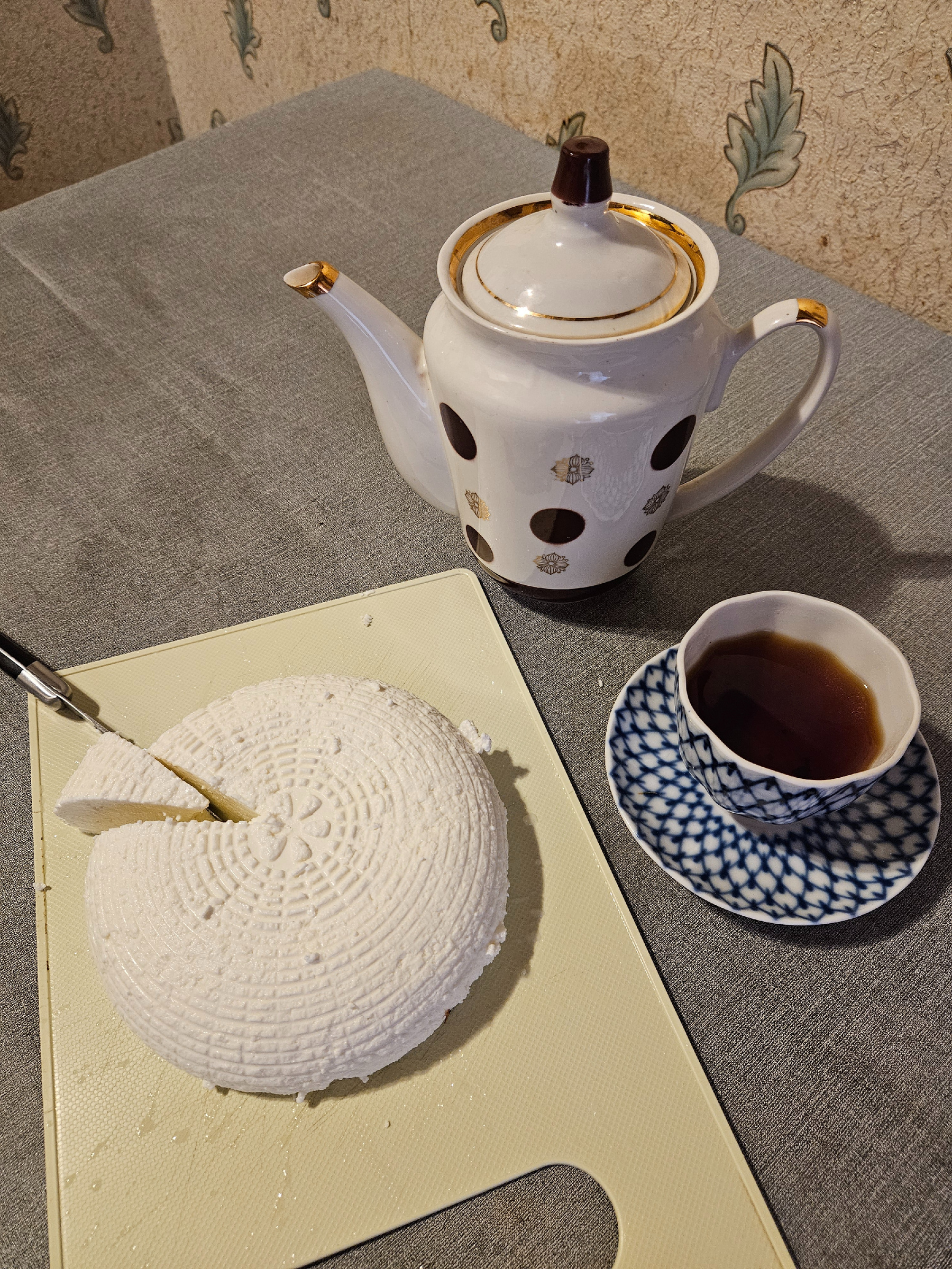Я уже не вспомню каким именно образом у нас зародилась гениальная идея попробовать сделать сыр самим. Вроде бы мы обсуждали перспективу завести пяток коз. Но козы не завелись, а идея приготовить сыр - осталась. В связи с полным отсутствием знаний и навыков, на известном маркетплейсе был найден и приобретен набор юного химика начинающего сыровара, включавший в себя сычужный фермент, закваски, хлористый кальций, мерную ложечку, термометр, форму и дренажный коврик. Ну и книжку рецептов. Оказался набор очень удачным, кстати говоря. Весь необходимый набор и приличного качества. Не, можно было на первое время сколхозить многое из подручных средств типа наделать дырок в ведре из-под мороженного и т.д., но я предпочла не отвлекаться еще и на это, т.к. сам по себе процесс варки сыра выглядел достаточно пугающим. В прилагающейся книжке рецептов был аж десяток разных сортов сыра. Всякие умные варианты типа гауды, чеддера и маасдама я отложила на потом, ибо одно прочтение рецепта наводило на мысль о суициде. Самым простым выглядел рецепт сыра сулугуни. Первой проблемой стало молоко. Правильно делать сыр из фермерского. Но мне же не терпелось срочно-обморочно приступить, а фермерского молока так быстро найти мы не смогли. И купила я в магазине 3 литра обычного. Только взяла не ультрапастеризованное ,а просто пастеризованное. Засыпала все куда нужно по инструкции (вообще, в попытках понять что такое делать сыр, я изучала информацию и она оказалась очень противоречивой. В одном материале рассказывают, что обязательно нужно простерилизовать чуть ли не с хлоркой посуду, инструменты, себя, дом, кошку и т.д., а в соседнем видео в чан с молоком суют руки по локоть для определения температуры. Так что я взяла нечто среднее и просто промыла посуду с содой) Штош. Сгусток, который по инструкции должен был сформироваться за 40 минут, забыл это сделать. Вместо сгустка по поверхности плавали какие-то невнятные хлопья. Молока было жаль и с помощью все тах же советов из интернета брюки превратились сулугуни превратился в адыгейский. Я просто выловила все эти хлопья сырного зерна и запупырила в форму стекать. И оно даже стекло и самоспрессовалось. Тут бы мне и остановиться, но в рецепте к сулугуни было велено приготовить 20% соляной раствор для выдержки сыра из расчета 3 часа на каждые 500гр головки. Ну а чем тут адыгейский хуже? Отправила я его солиться. Даже не на 3 часа ,а на 2. Итог перед вами.