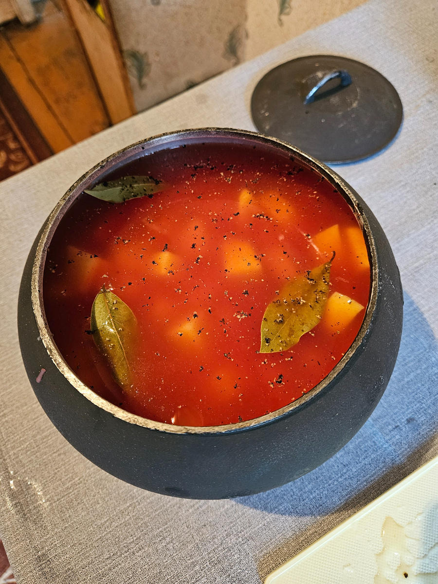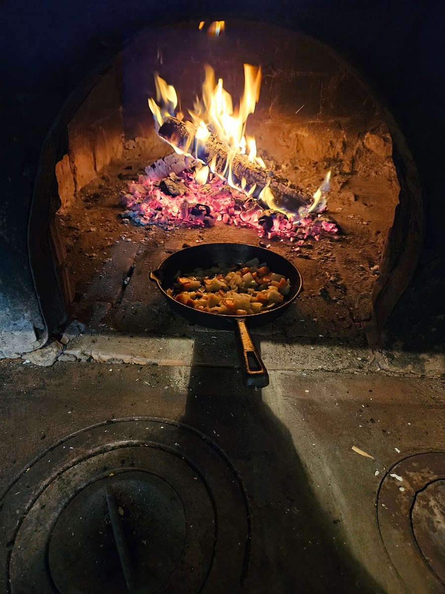 Признаюсь, мне было жутко волнительно и нервно. Ведь это мой первый опыт готовки в настоящей печке. Еще перед первым заездом в новый дом я озаботилась соответствующей посудой. Как известно, для печи подходит только чугунная и керамическая. Конечно же мне хотелось всамделешный чугунок по всем стандартам, но реальность была несколько печальна. Найти хорошую чугунную посуду для печи оказалось несколько проблематично. Да, в интернете и на маркетплейсах продается огромное количество всяких казанов, грилей, воков и прочего. Но вся эта посуда мало пригодна для печи, т.к. специфика топки такова, что посуда должна быть с минимально возможной площадью дна, иначе просто еда пригорит. Нужен именно чугунок как в сказке. А таких на рынке не очень много и подавляющее большинство из алюминия. Понятно, что такая посуда легче и в чем-то прочнее, нежели чугунная, но на сколько мне известно алюминий не любит длительного контакта с продуктами. Чугунную посуду я, конечно, нашла. Но ценник на нее был таким космическим, как будто она на вес золота продавалась. Честно скажу, жаба меня задушила выкладывать 5–6 тысяч за один чугун. Тем более, что я еще не очень представляла какой мне нужен, сколько их должно быть и подружусь ли я в итоге с таким методом приготовления. Потому я приняла волевое решение и купила-таки алюминиевый чугунок с крышкой на 2,5 литра, справедливо решив, что, если дело пойдет, я всегда смогу купить более качественную посуду.