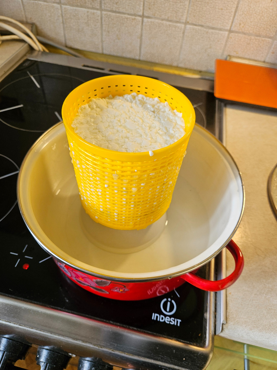 В итоге мы должны получить такой результат. Оставляем массу отдохнуть минут 10. За это время сырное зерно опустится на дно. Далее по фэншую нужно вычерпать сыворотку, пока не появится зерно, но в моих масштабах я этим пренебрегаю. Берем форму и аккуратно шумовкой вычерпываем зерно и кладем в форму.