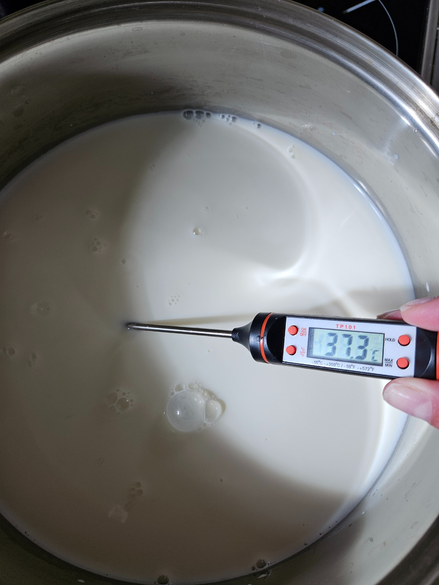 Если у вас молоко не пастеризованное, то пастеризуем. Нагреваем его до 70 градусов и быстро остужаем (ставим в таз или ванную с холодной водой). Если же молоко, как в моем случае, пастеризовано, то просто нагреваем его до 37-38 градусов.