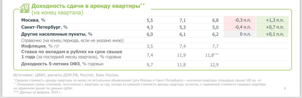 На глаза попался отчет Дом.рф «ОБЗОР РЫНКА АРЕНДЫ ЖИЛЬЯ В РОССИИ ЗА I КВАРТАЛ 2024 ГОДА».