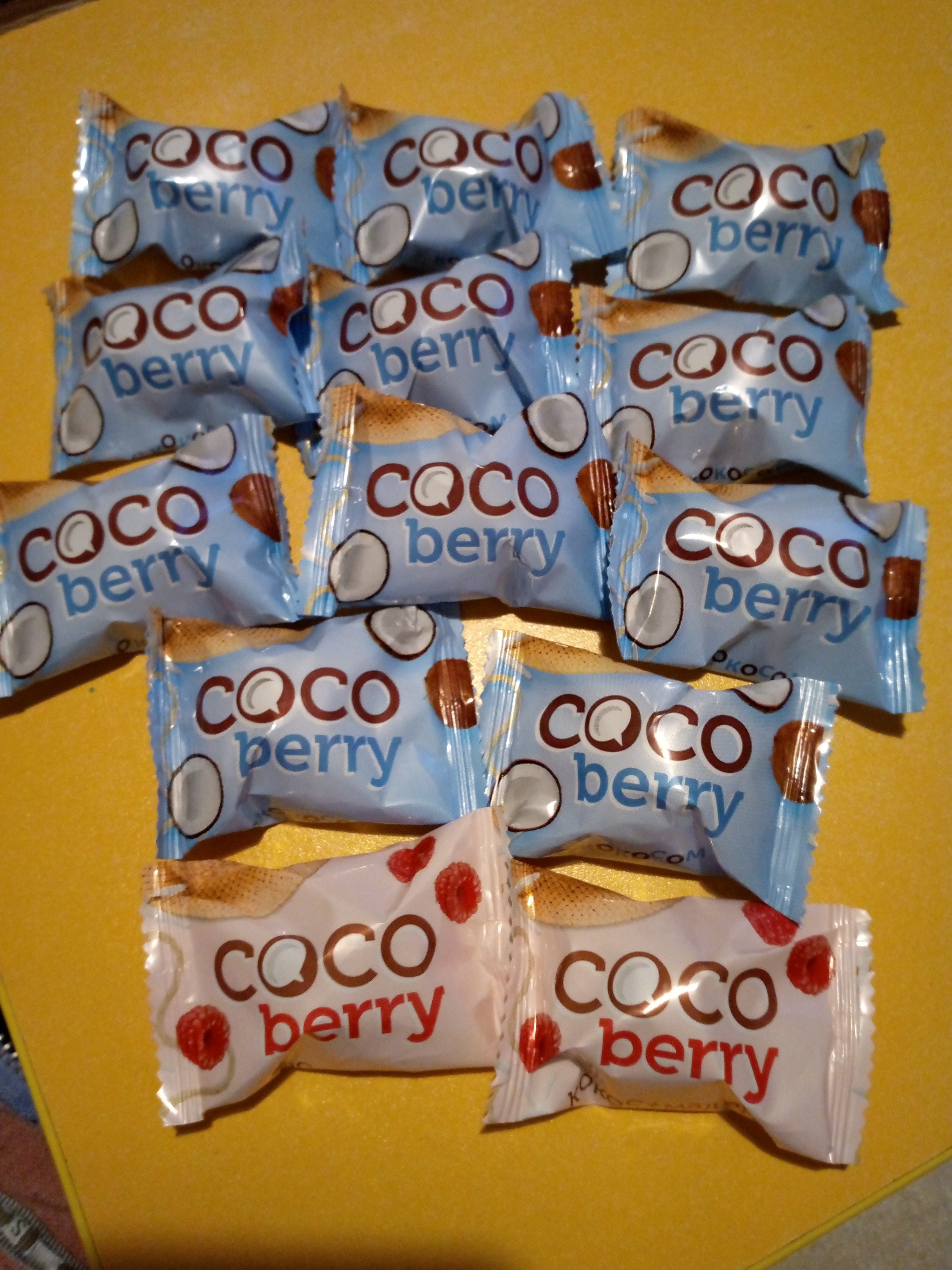 Смотрела что купить вкусненького к чаю и мой взор упал на эти конфетки от производителя konditerprofi. Заинтересовало сочетание "Кокос и малина", так и написано на упаковке. Но! При вскрытии пачки я увидела кокос и две конфетки кокос+малина.