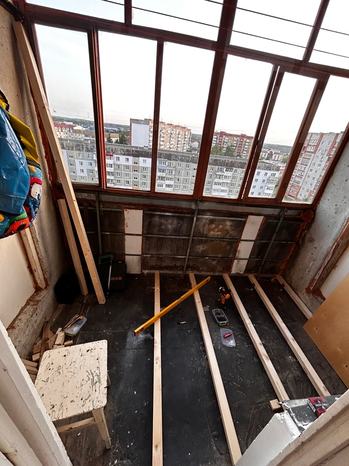Пару месяцев назад искал мастеров, чтобы поднять и выровнять пол на лоджии (размер: 2,5*1,5), но не устроила цена (просили 15к за работу без учета материалов). Сам, по природе, рукожоп, и подобного ничего не делал, но подумал и решил, а ну его, попробую сам... После поиска различных технологий и тонн роликов на ютуб, начал делать из брусков.