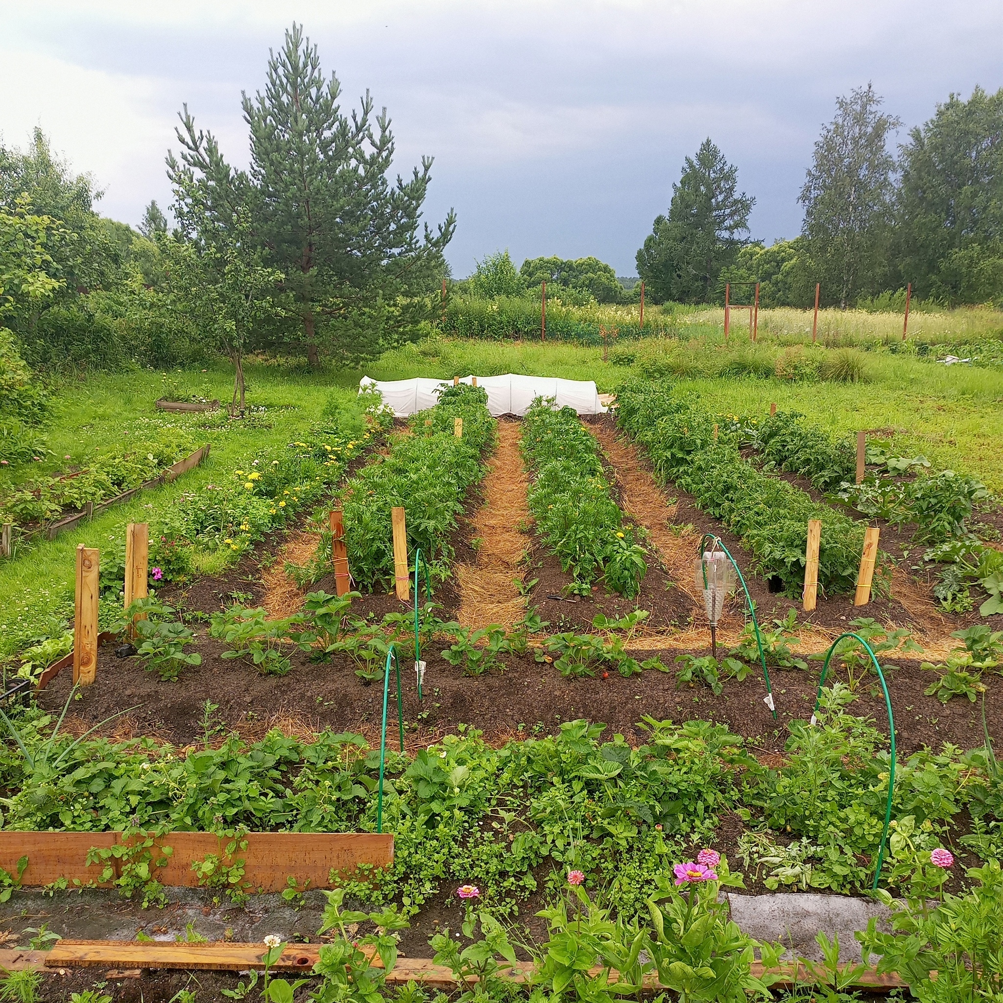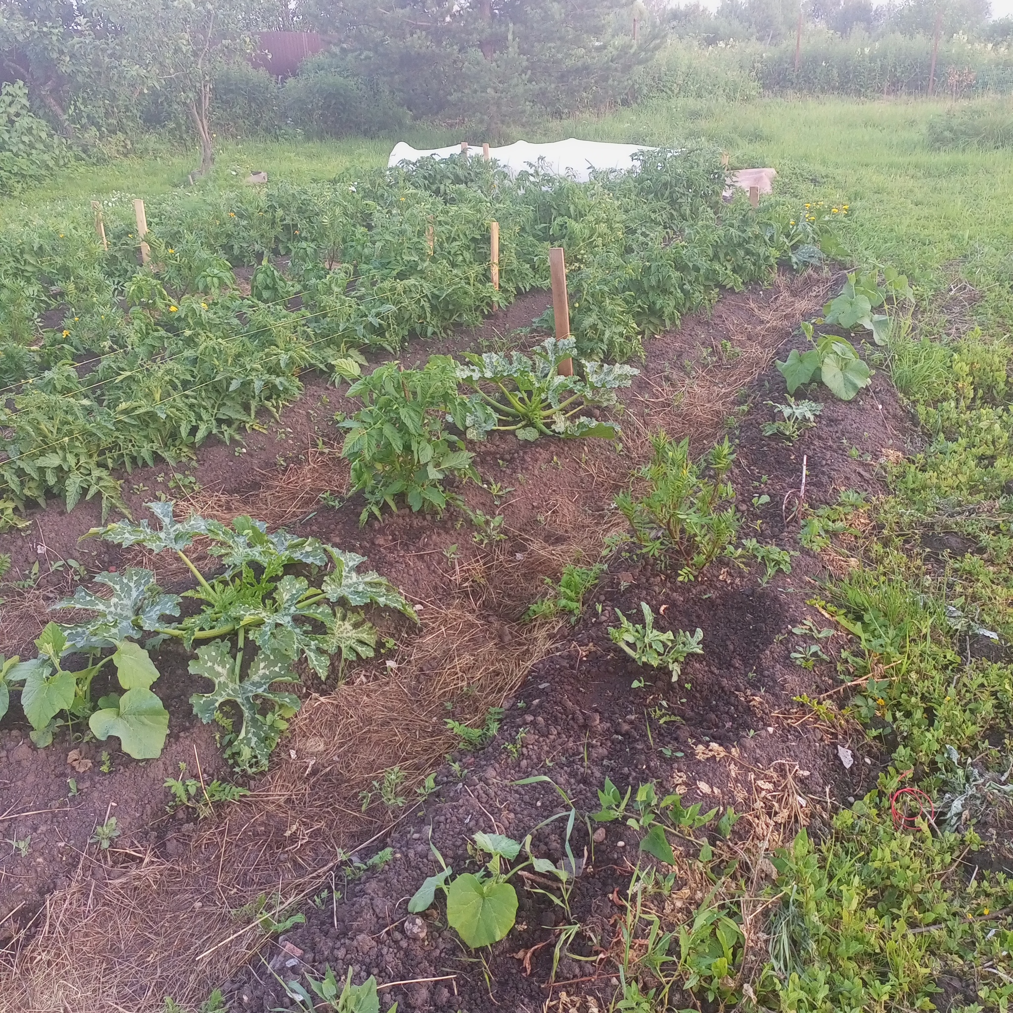 Сегодня кратко. Добавлю только что подкармливаю раз в десять дней всё монофосфатом калия. Азота у меня и так много в земле. Стебли и листья жирные и тёмно зелёные. Поливаю вечером из лейки с ситечком. Две лейки на десять метров грядки. Цель не полить, а смочить листья. Поливает за меня дождь))) А так как дорожки засыпаны мульчой из скошенной травы, то влаги хватает до следующего дождя.