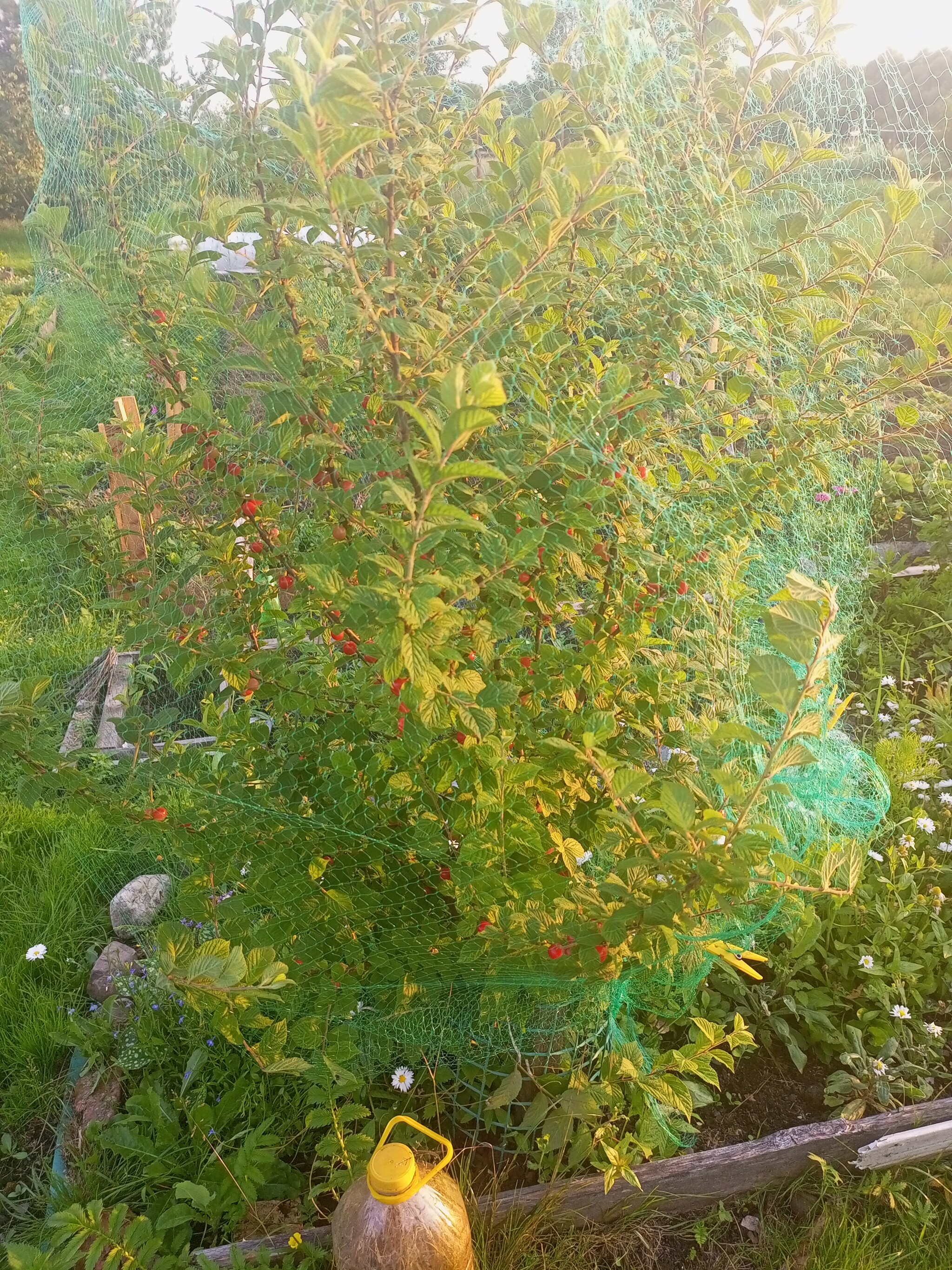 Вишня войлочная. У меня третий год. Первый раз ягоды. Пришлось закрыть сеткой, птицы ягодами даже созреть не дают.