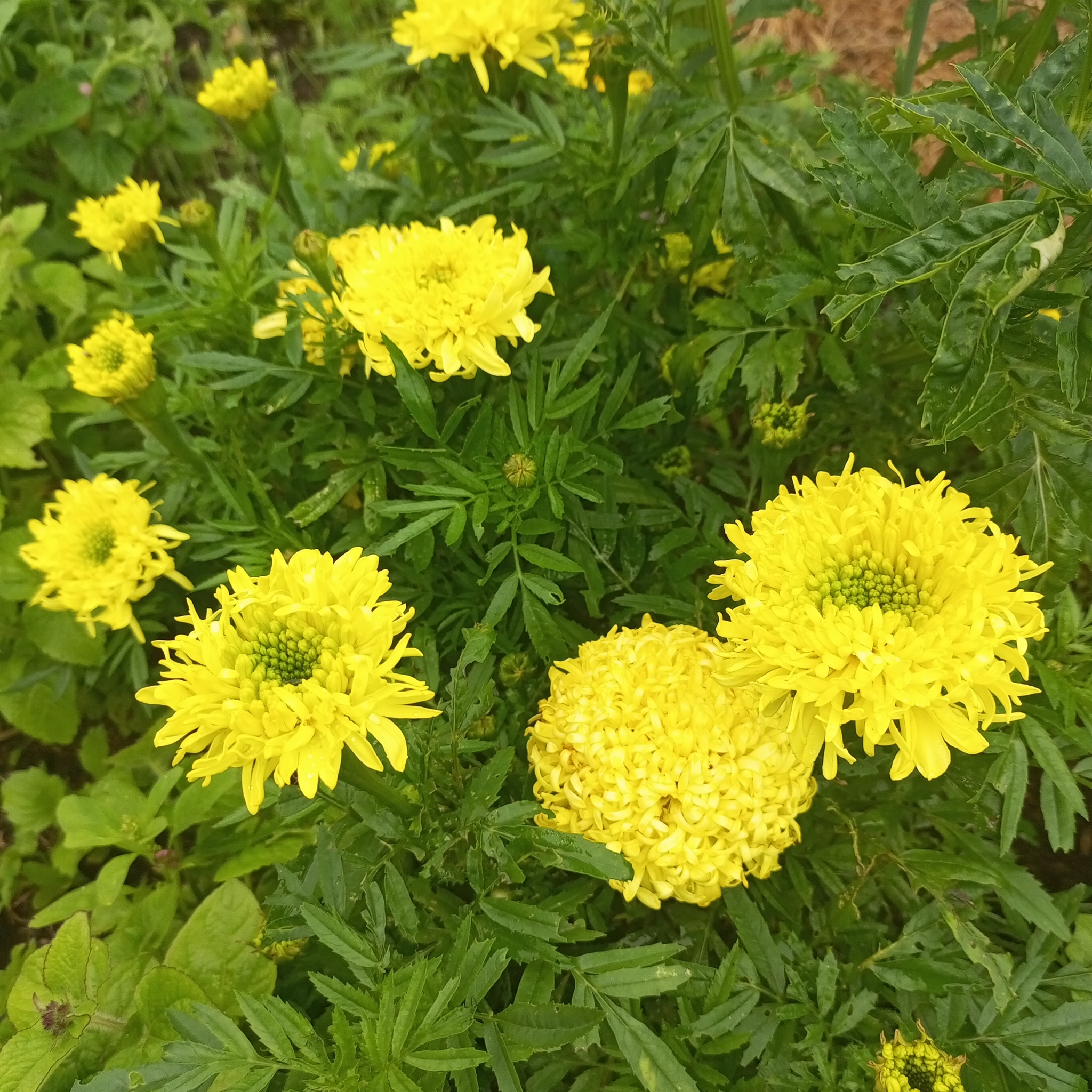 Овощные культуры в этом году ничем не закрывала. Между кустов посажены бархатцы, в жару притеняют и защищают от вредителей. Ну и просто красиво. Кстати, у меня есть вот такой интересный бархатец Хризантема лимон. Реально похож на хризантему.