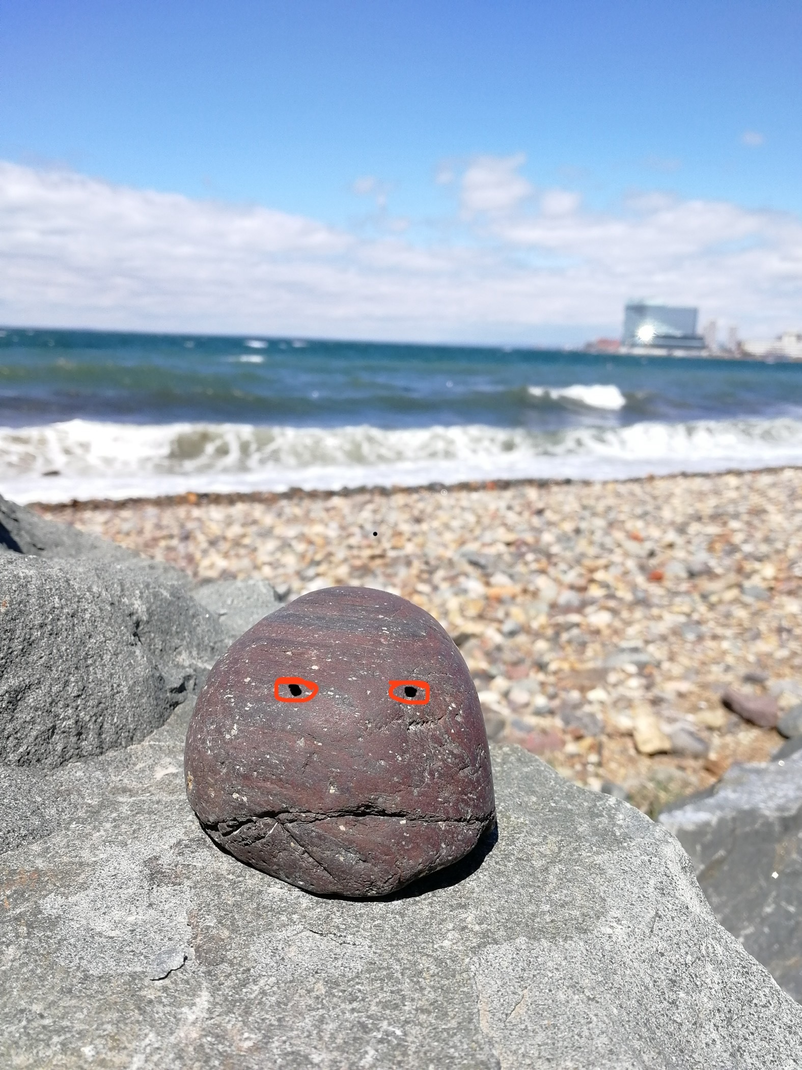 Он пользовался большим пиететом среди прочих, ибо был из старейших, гранитной породы с мелкими вкраплениями кварца, что мог родится только глубоко в недрах земли под огромным давлением, его овальная, чуть сплюснутая в центре, форма говорила о том, что море тысячи лет ласкало его своими пенными объятиями, к тому же, как твёрдую породу, по зиме его выталкивало наверх и он чаще всего высился выше остальных, если только какой-нибудь нахалец не пытался взгромоздится на него, но резкое движение и сама форма быстро скидывали нахала вниз.
