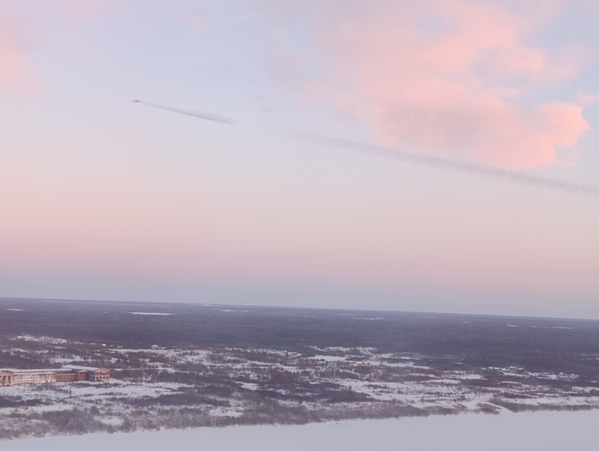 Это старый работяга, вертолет Ми-8, который в минус 45 градусов везёт очередную смену на промысел в Заполярье. При такой температуре инверсионный след у него, как у сверхзвукового самолёта, с добавлением копоти от возрастной турбины.
