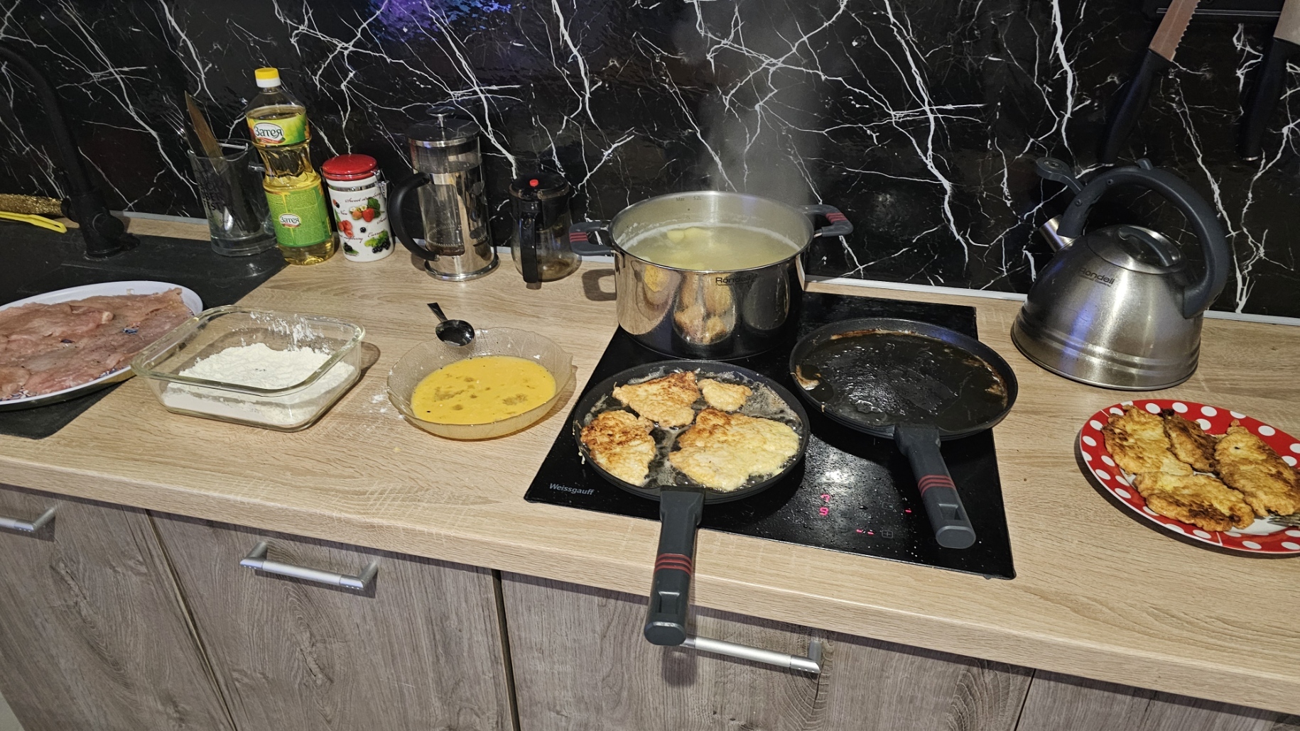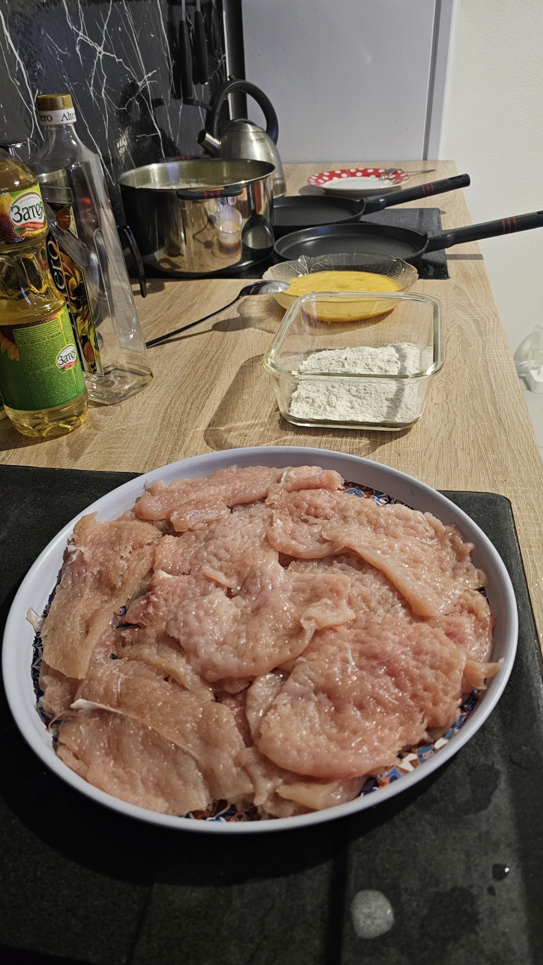 Процесс прост: обваливаем мясо в муке, макаем в яйца, чтобы всю муку покрыть и кладем на сковороду. Обжариваем с 2 сторон на максимальном огне и снимем. Я для жарки использую 2 блинные сковородки. Если есть дополнительная пара рук, которая будет пригорающую муку со сковородок снимать и подливать масло, можно готовить одновременно на обеих. Скорость увеличится раза в 3-4. Тут же я готовил один, поэтому использовал сковородки по очереди. Пока в одной жарится - мою руки от муки и скидываю со второй сковородки огарки. Затем меняю.