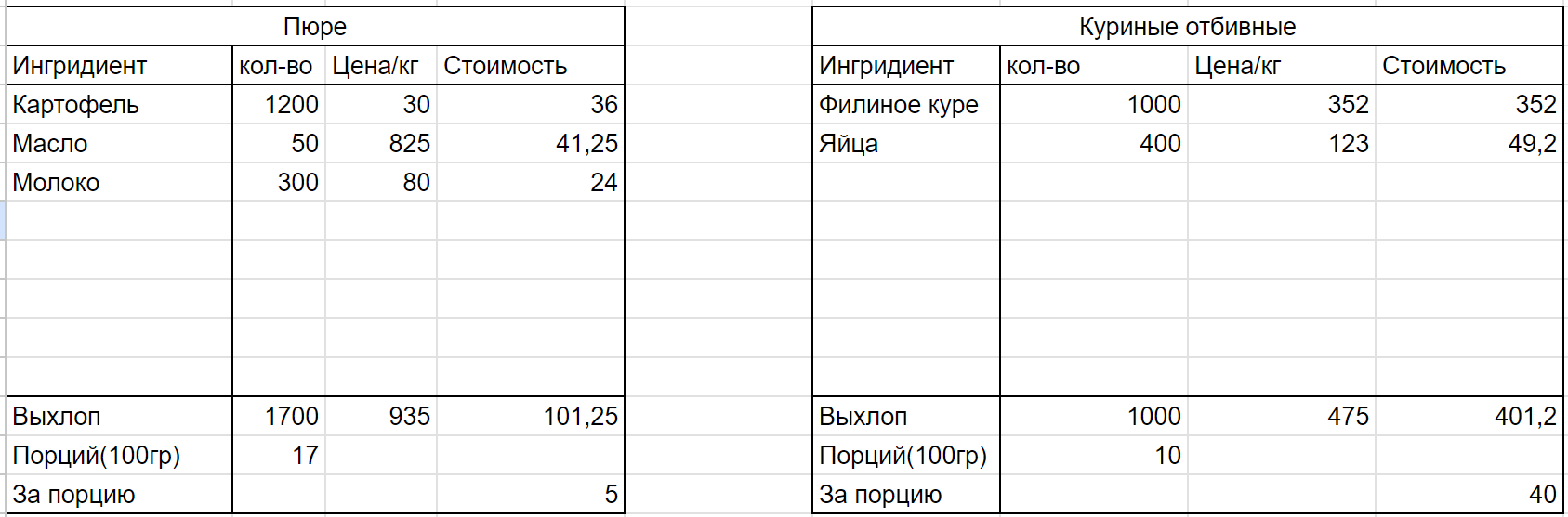 400 яиц имеется ввиду, конечно, 4 штуки. Просто лень под них таблицу менять, которая все в граммах считает