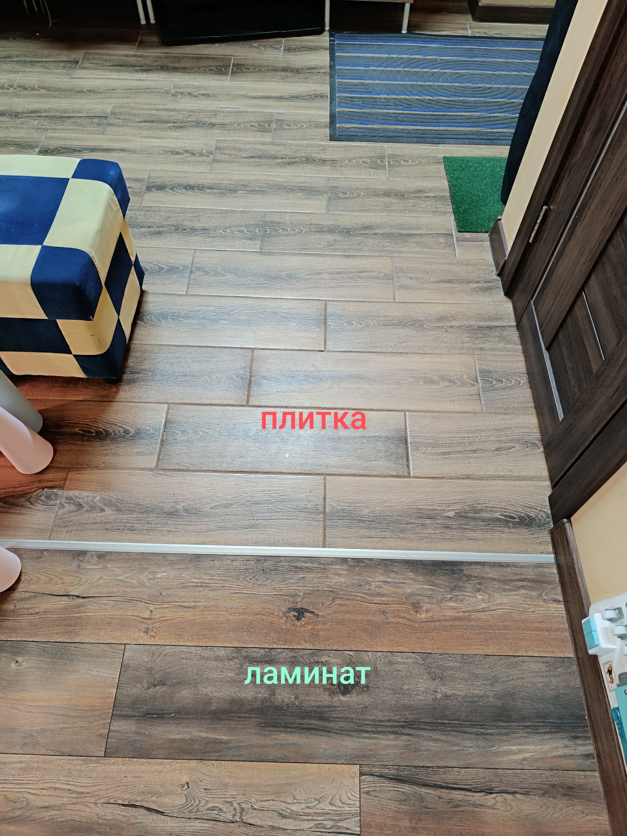 Плитка в коридоре. Это идея мужа, но именно в моей работе это прям то, что надо. Не все дети ждут, пока их переоденут, они уже топают куда-нибудь, пока родители только переступают порог. Да и во время каши на улицах это тоже спасает, дети занимают весь коридор и в грязной обуви, с грязью и снегом топчутся просто везде. А так шваброй протер и молодец :) (некоторые прям в коридоре стелят ковролин, я б не выжила, его чистить)
