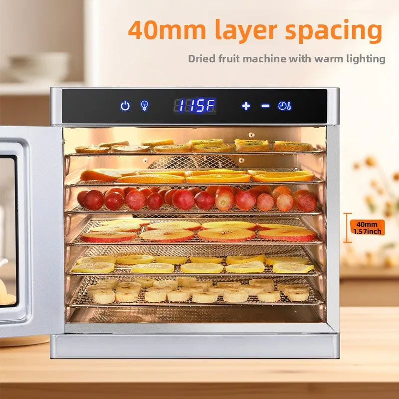 6. Шестислойная сушилка для продуктов из нержавеющей стали Сушилка для обезвоживания продуктов рассчитана на приготовление вяленого мяса, сушёных фруктов, овощей и трав в домашних условиях. Шесть уровней дают возможность одновременно загружать разные продукты, равномерно распределяя воздушный поток по всей камере. Корпус из нержавеющей стали устойчив к нагреву и легко очищается после использования.