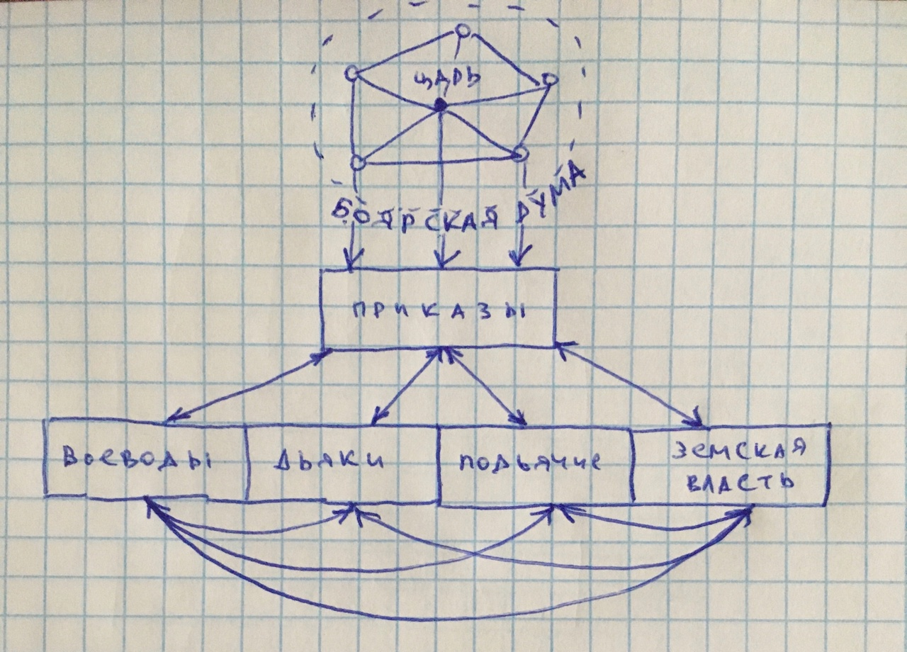 Изображение сверху - это попытка изобразить, как выглядела модель управления в XVII веке (самая общая схема). Понятно, что здесь нет церковной ветки власти, нет военной ветки, нет инородческой ветки и т.д. Здесь только самая база, относящаяся к статье автора.