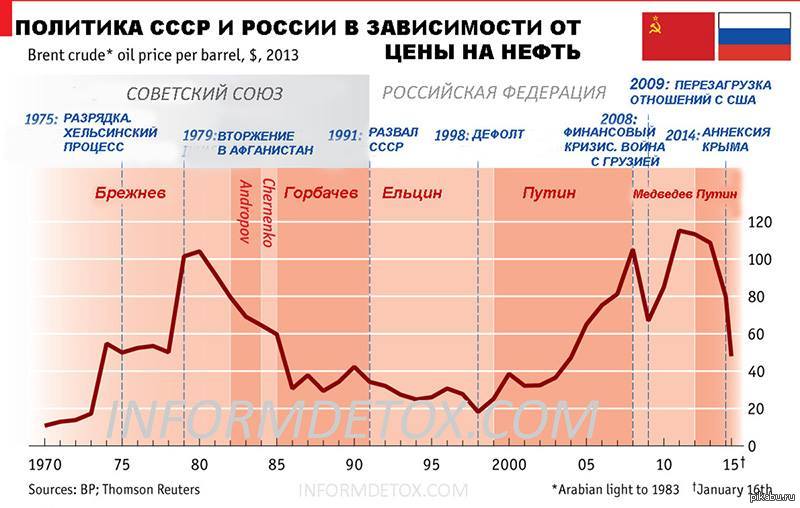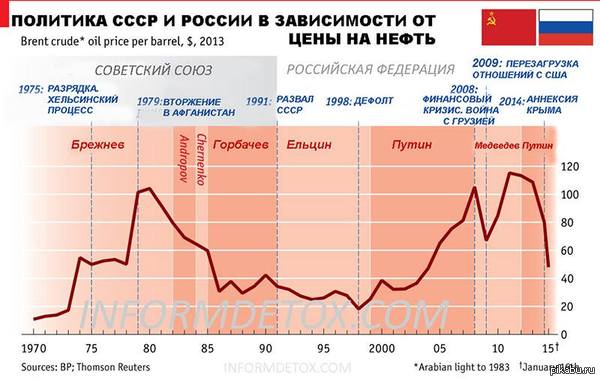 InformDetoxcom Политика Политика СССР и России в зависимости от цены на нефть 10 лет назад График, объясняющий кто и что управляет внешней политикой России. Подробнее http://www.informdetox.com/?p=16143 [моё] Нефть Россия Политика История
