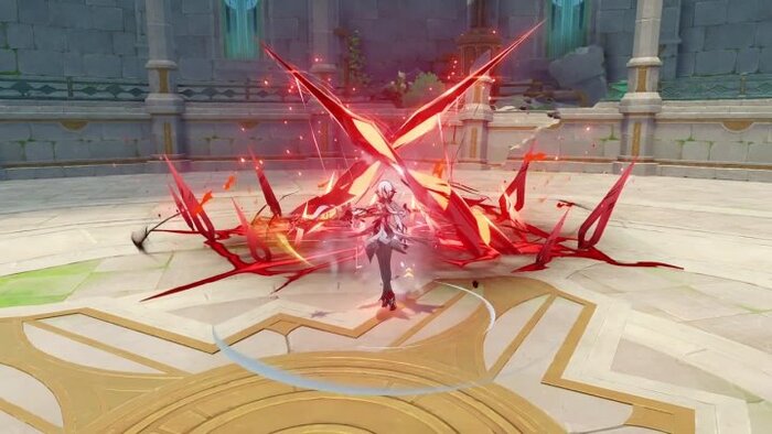 Элементальный навык деактивирует весь Долг жизни и восстанавливает соразмерное долгу количество HP. Параллельно Арлекино совершает атаку по области, а затем рывок в сторону одного противника. Оба удара вызывают у получивших повреждения соперников эффект «Кровавый долг». Статус держится на монстрах 30 секунд, однако наносит периодический Пиро дамаг только 3 раза. Заряженная атака по врагу с меткой снимает «Кровавый долг» со всех целей и накладывает новый Долг жизни на Арлекино, по 20-70% за каждого противника до макс. 80%.