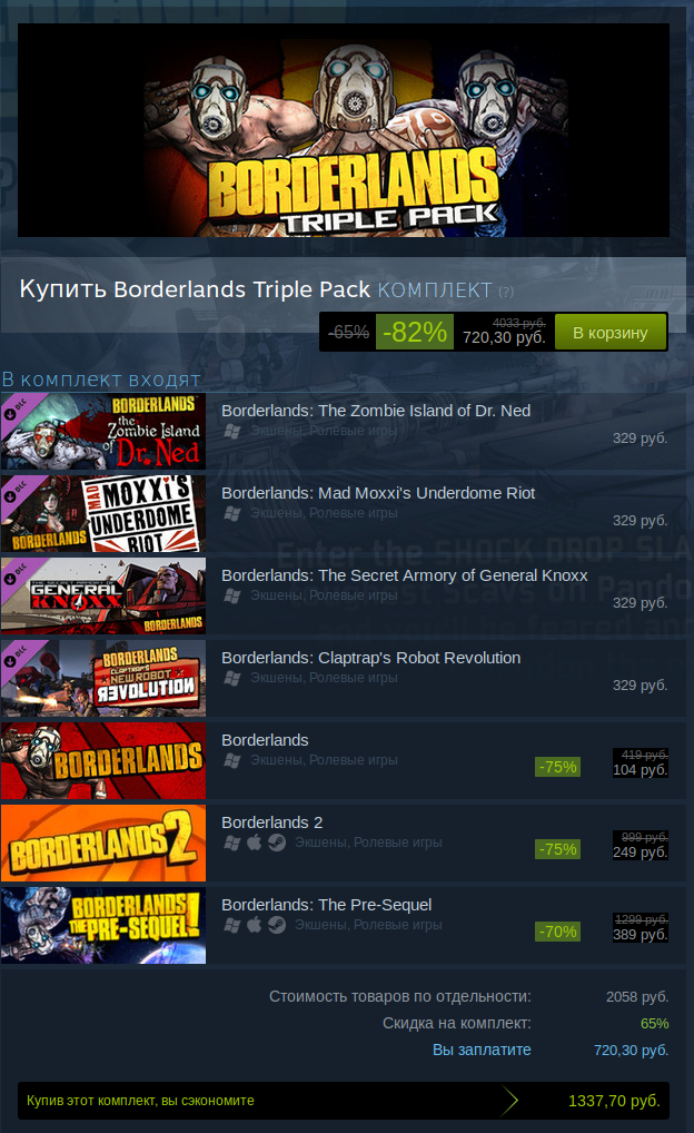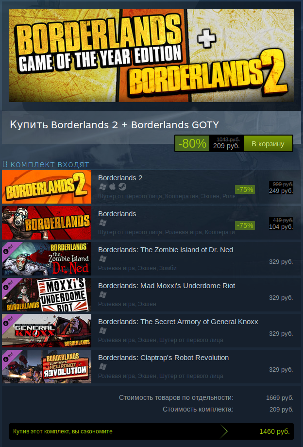 если имея этот комплект попытаться купить предыдущий, то стим отбросит все игры и dlc, которые у вас уже есть и оставит только отсутствующие - в нашем случае это Borderlands: The Pre-Sequel. получится, что в составе покупаемого нами пака будет всего 1 игра, но цена её будет 136 рублей