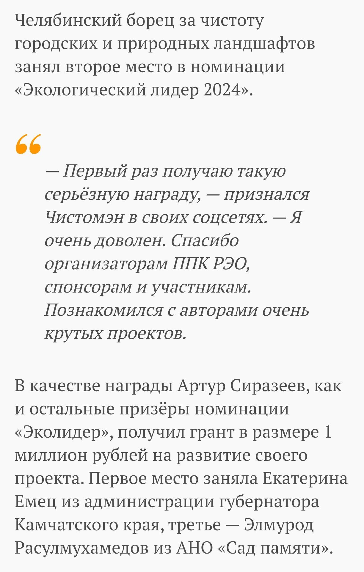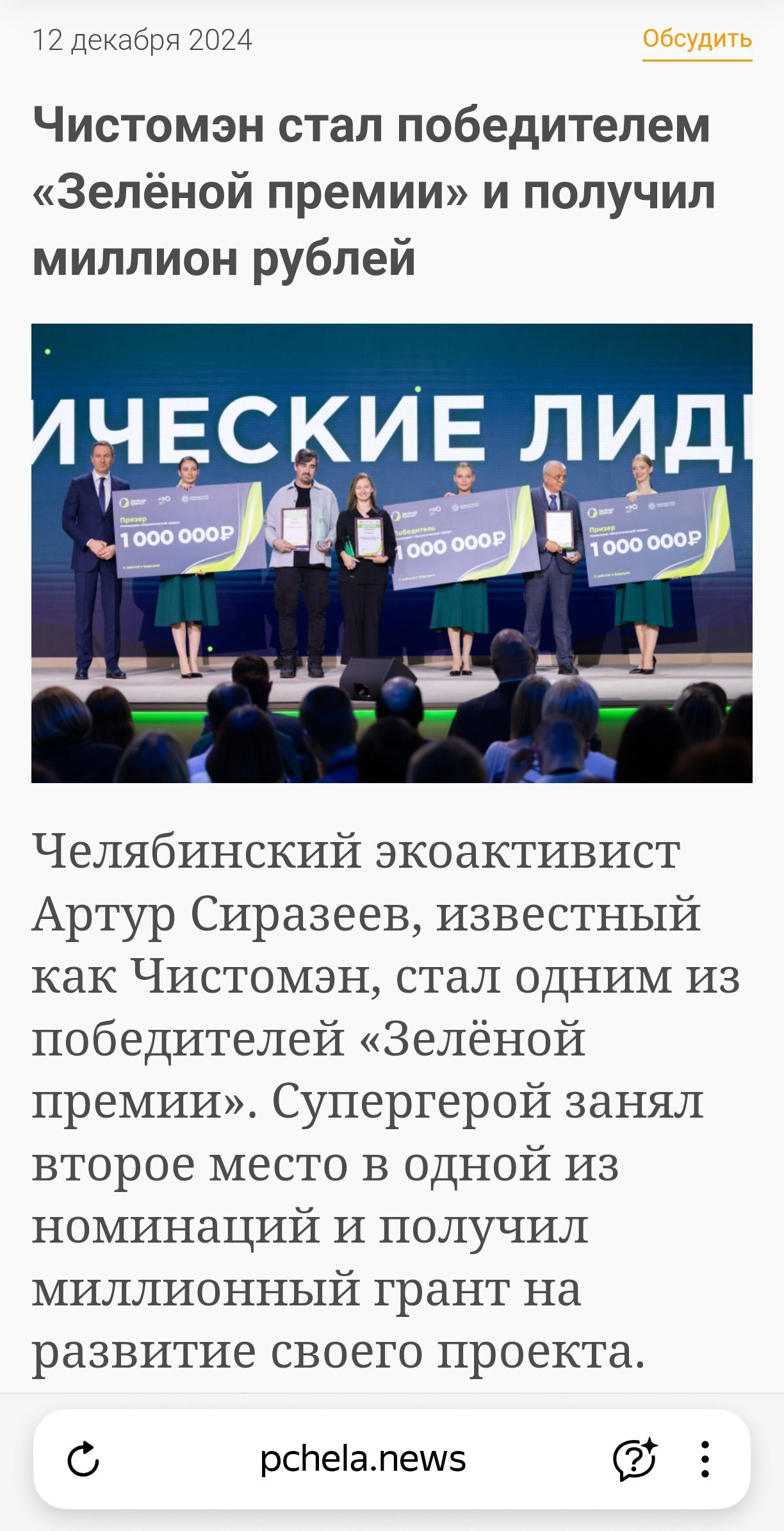 Факт получения 1000000 (одного миллиона) рублей от конкурса "Зеленая премия" подтверждается в СМИ, Чистоменом самим в ВК, и на сайте самого конкурса Зелёная премия