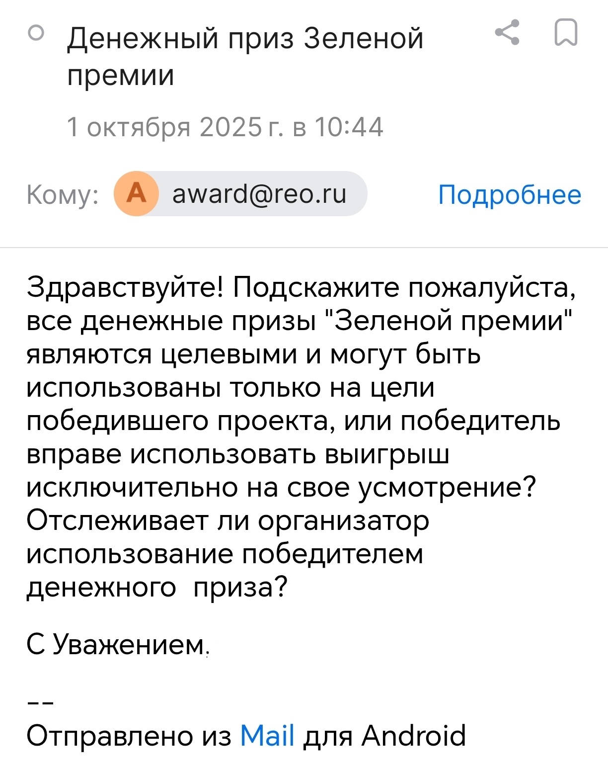 Чтобы до конца убедиться в том что же из себя представляет выплата победителю конкурса "Зеленая премия" я отправил запрос организатору. По ответу немедленно запилю пост, если конечно уважаемая администрация Пикабу в очередной раз не сочтет мой пост "преследованием и травлей" и я снова не окажусь забанен.