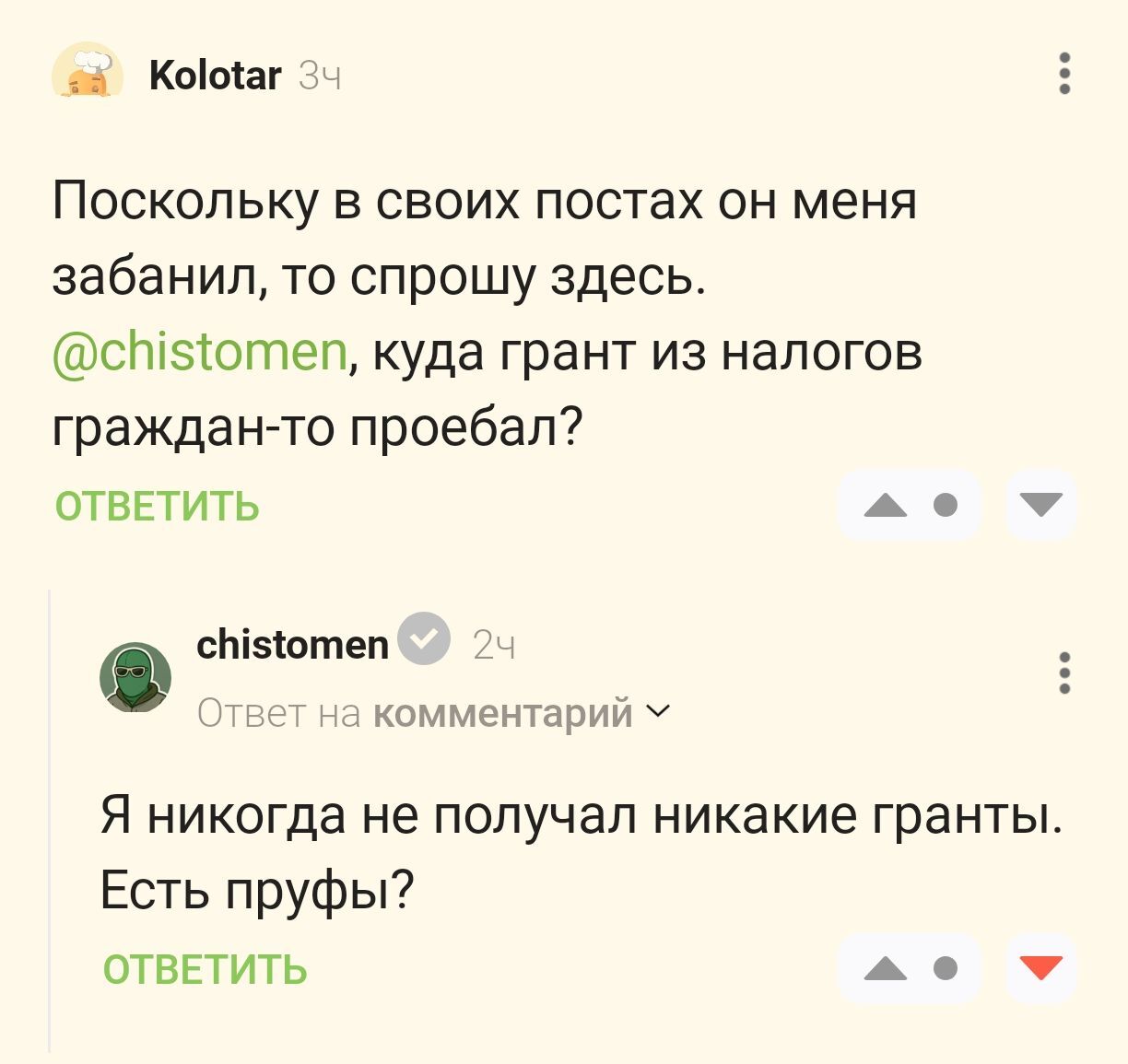 #comment_368713191 (на момент публикации родительский пост этого комментария уже удален, вследствие этого ссылка не работает, но скрин ответа Чистомена остался)
