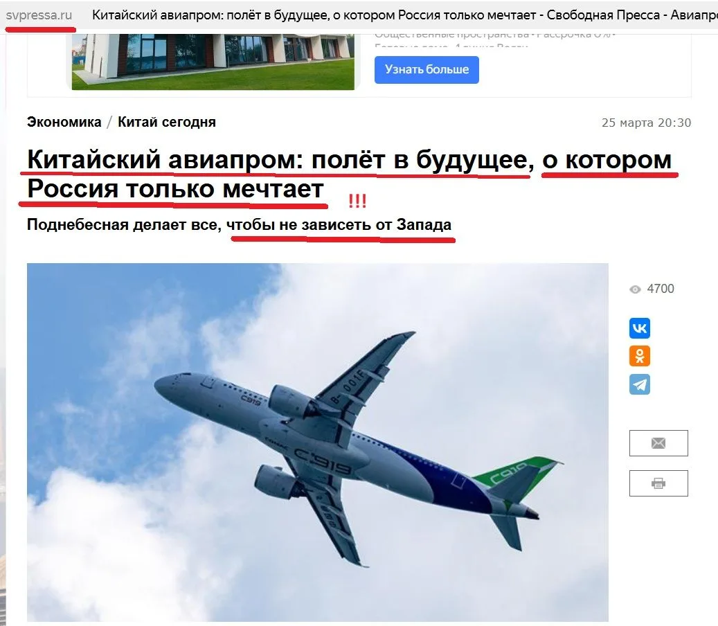 Наша засоветская "Свободная пресса" отбрасывает химеру совести (адекватности?). В единственной на планете стране с поднятыми в небо и готовящимися к коммерческой эксплуатации полностью отечественными ближне- и среднемагистральными лайнерами нам рассказывают у кого РФ должна поучиться...импортозамещению в авиастроении. Причём такому, о котором России остаётся "только мечтать".
