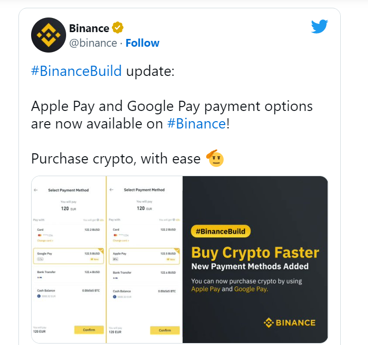Пользователи Binance теперь могут использовать Apple Pay и Google Pay