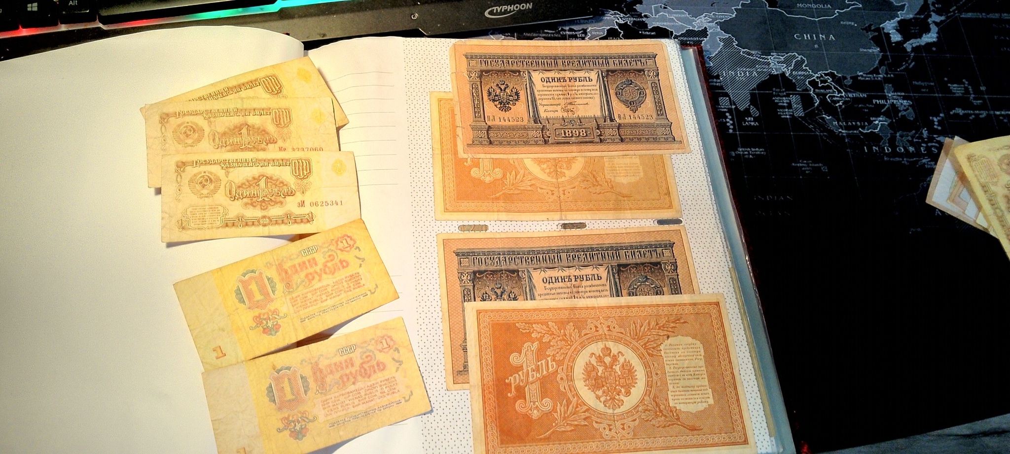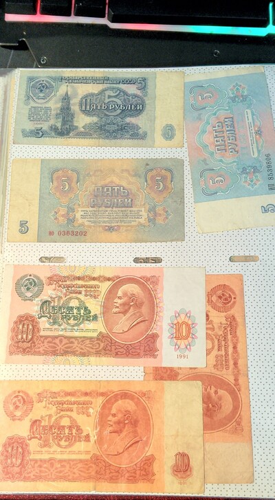 Обрати внимание: в твоем коллажике присутствуют как полновесные советские деньги ( менее цветастые) так и "павловские фантики" ( пестрые. не однотонные) времен когда инфляция "вот вот и скаканет".