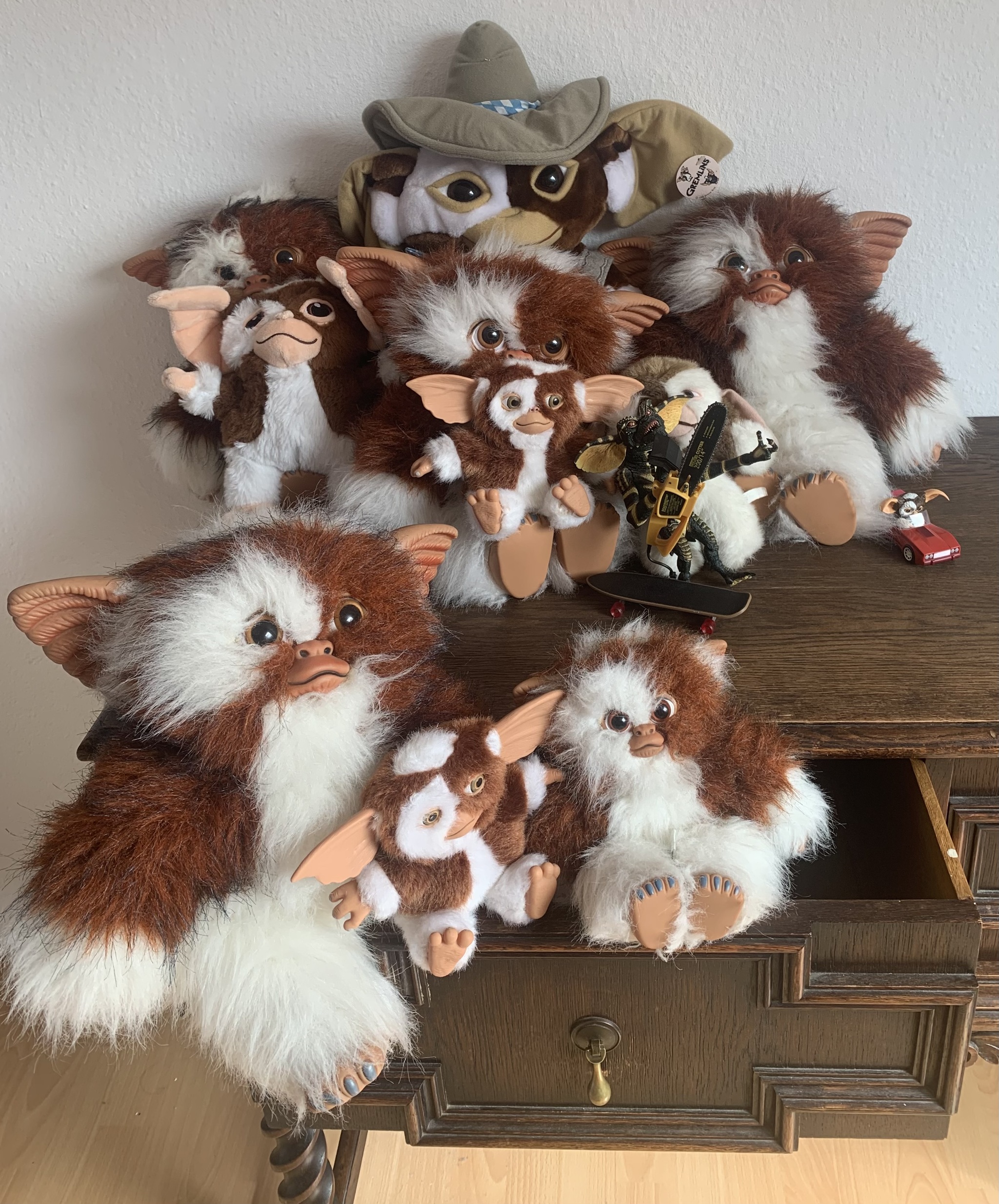 Сначала милейший пушистик Гизмо , добрый, трогательный, хочется забрать его домой и гладить бесконечно. А потом — монстры , которые вытворяют всё, что только можно. В детстве меня это впечатлило настолько, что я ещё долго боялась наливать воду на игрушки, вдруг и они оживут. Снятый в середине 80-х, этот фильм до сих пор не потерял своего шарма. Лично я пересматриваю его каждый год и он дарит мне новогоднее настроение не хуже, чем «Один дома».Но что же делает «Гремлинов» такими особенными?История начинается с того, что изобретатель Рендалл Пельцер ищет необычный подарок для сына на Рождество. В одном магазине китайского квартала он находит загадочного зверька — Могвая. Он милый, пушистый и моментально покоряет сердце. Его владелец, мистер Винг, отказывается продавать существо Рендаллу, но внук мистера Винга тайно соглашается на продажу . Но вместе с ним хозяин получает строгие правила. Могвай не выносит яркого солнечного света, его нельзя мочить водой и уж тем более нельзя кормить после полуночи.Стоит нарушить эти правила — и милый Гизмо уже не будет таким безобидным.. Сюжет фильма сам по себе уникален на мой взгляд , смесь лёгкого, почти сказочного фэнтези и чёрного юмора, причём последнего здесь предостаточно. Добавьте к этому рождественскую атмосферу — и получится идеальная формула. Персонажи получились настолько яркими и живыми, что им действительно хочется сопереживать.С годами любовь к этому фильму никуда не делась. Теперь у меня есть небольшая, но быстро растущая коллекция игрушек и фигурок Гремлинов. Каждый раз, когда я держу в руках Гизмо , я возвращаюсь в то самое детство, когда кассеты с фильмами мы пересматривали по 100 раз.Но тогда купить игрушку по фильму было чем-то из разряда фантастики. В магазинах их просто не было, да и вообще коллекционные фигурки тогда казались чем-то из другого мира.Прошли годы. Я выросла и теперь сама исполняю те детские мечты, которые казались невозможными.Особенно люблю винтажные игрушки 80–90-х годов, но в коллекции есть и современные фигурки. Моя цель – собрать всех, от мягких Гизмо до самых редких выпусков. Каждый найденный Гремлин – это счастье для меня. Коллекция небольшая, но она растёт очень быстро. А может, ещё кто-то из вас собирает Гремлинов? Очень интересно увидеть чужие коллекции.