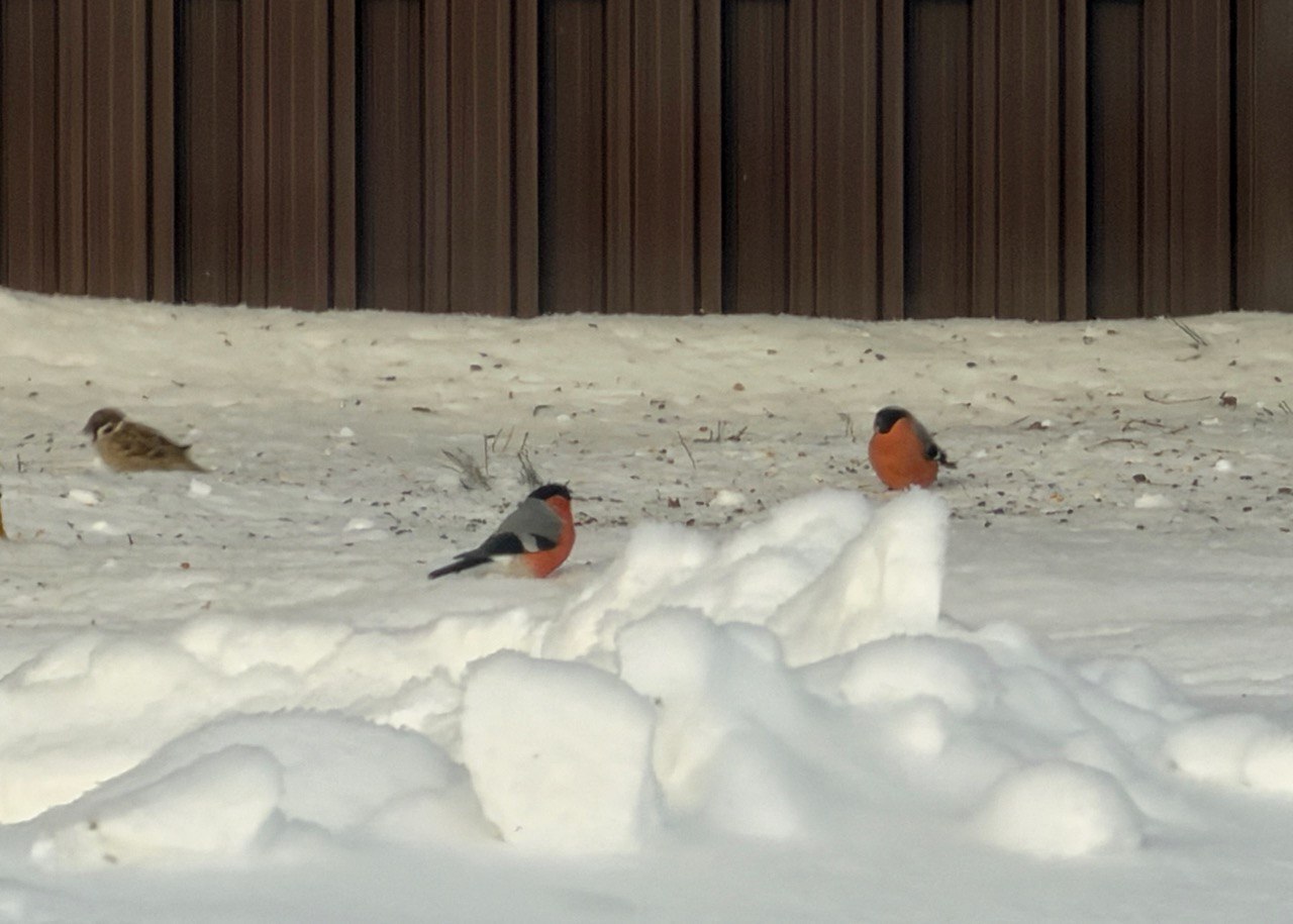 Во дворе у меня две кормушки, каждое утро наполняю их семечками и сушёным арахисом. Основные посетители моих открытых кафе - синички и полевые воробьи. Недавно видел снегирей, но их больше интересует калина и терновник, которые я специально оставляю на зиму, не снимая с кустов.