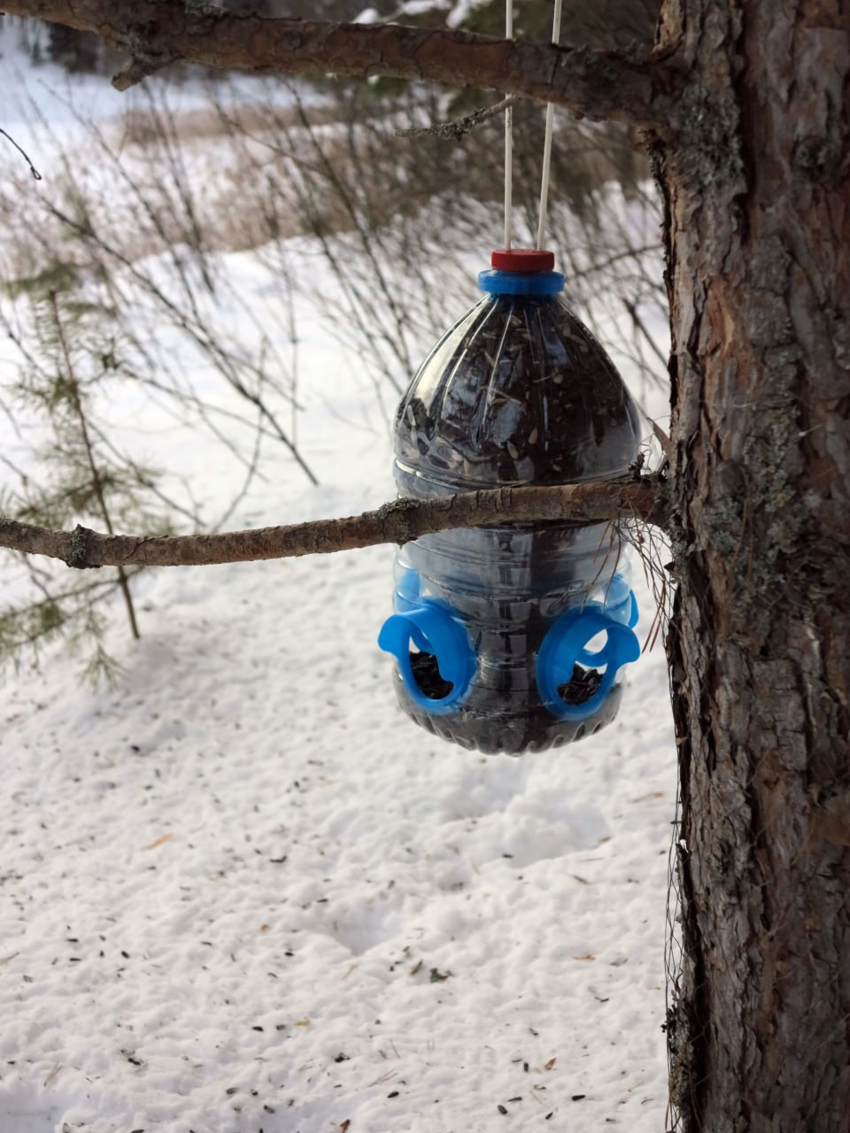 А если серьезно, то видел аккуратные кормушки сделанные из 5 литрушек. В лесу каждый день не подложить не сможешь, а так она какое-то время сама пополняется