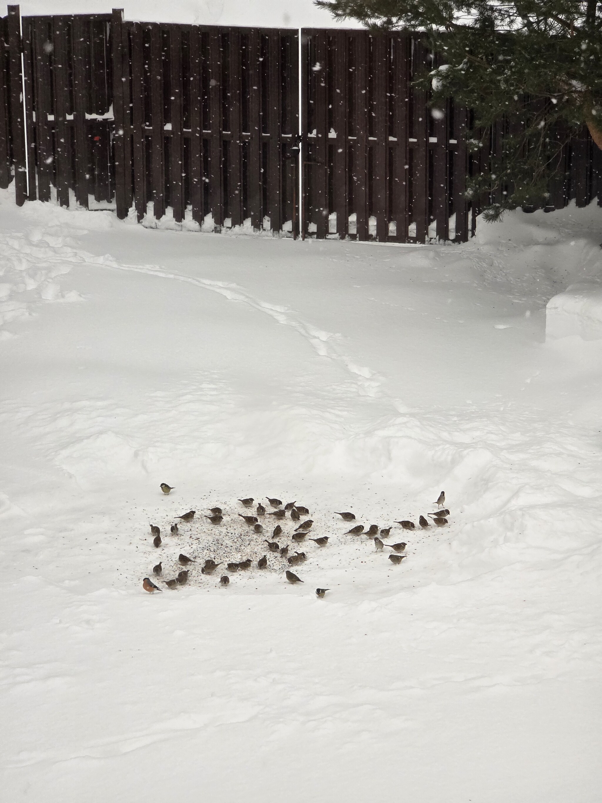 Во дворе у меня две кормушки, каждое утро наполняю их семечками и сушёным арахисом. Основные посетители моих открытых кафе - синички и полевые воробьи. Недавно видел снегирей, но их больше интересует калина и терновник, которые я специально оставляю на зиму, не снимая с кустов.