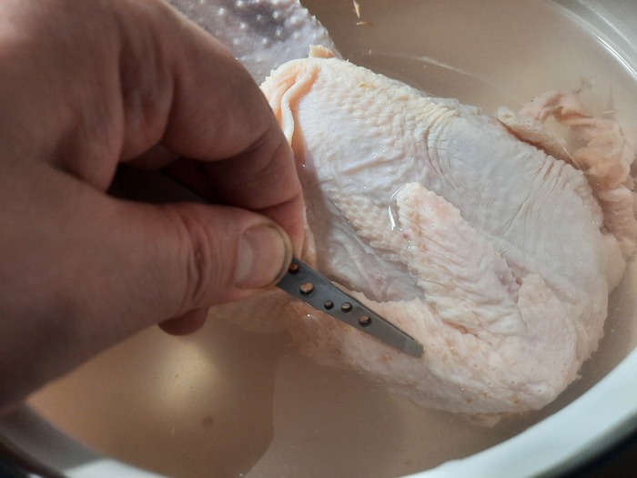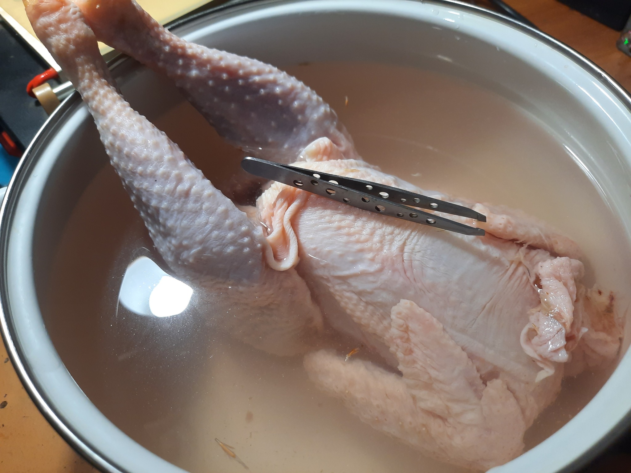 Не вместилась. Готовить немного умею, разрезал тушку, залил водой, (промыл, не беспокойтесь).