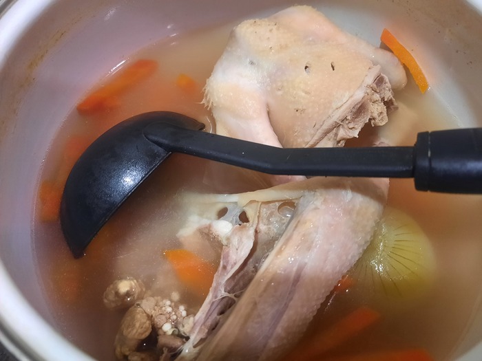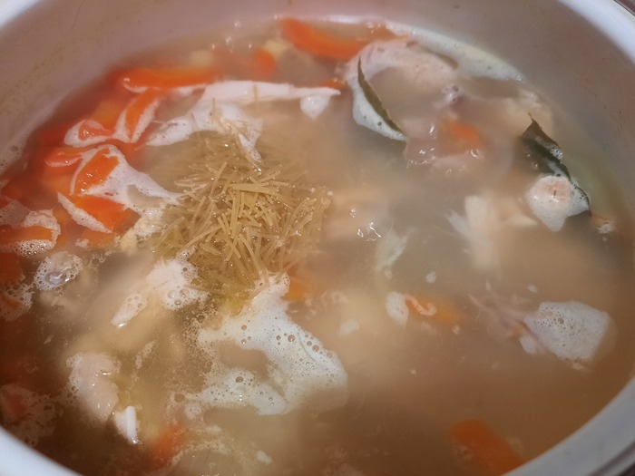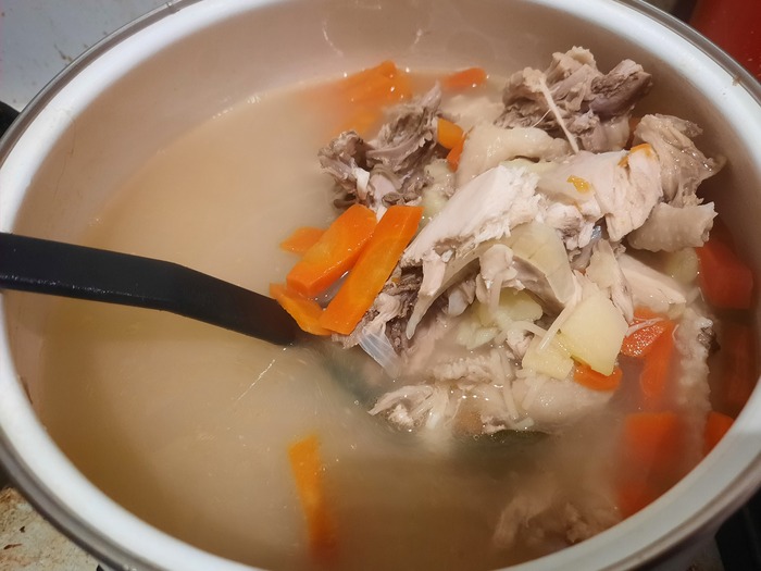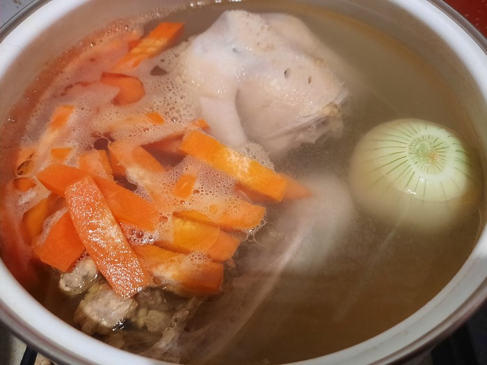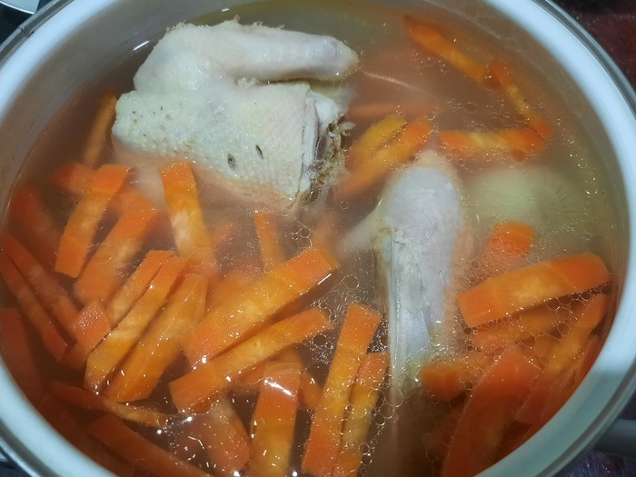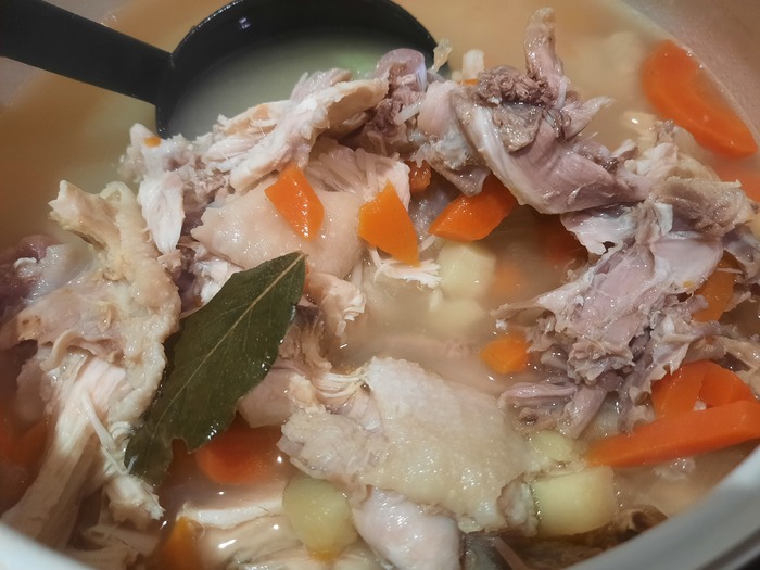 Почистил морковь и лук (по предписанию всё делал), курочка варилась долго, не ждите там полчасика, полтора что ли.
