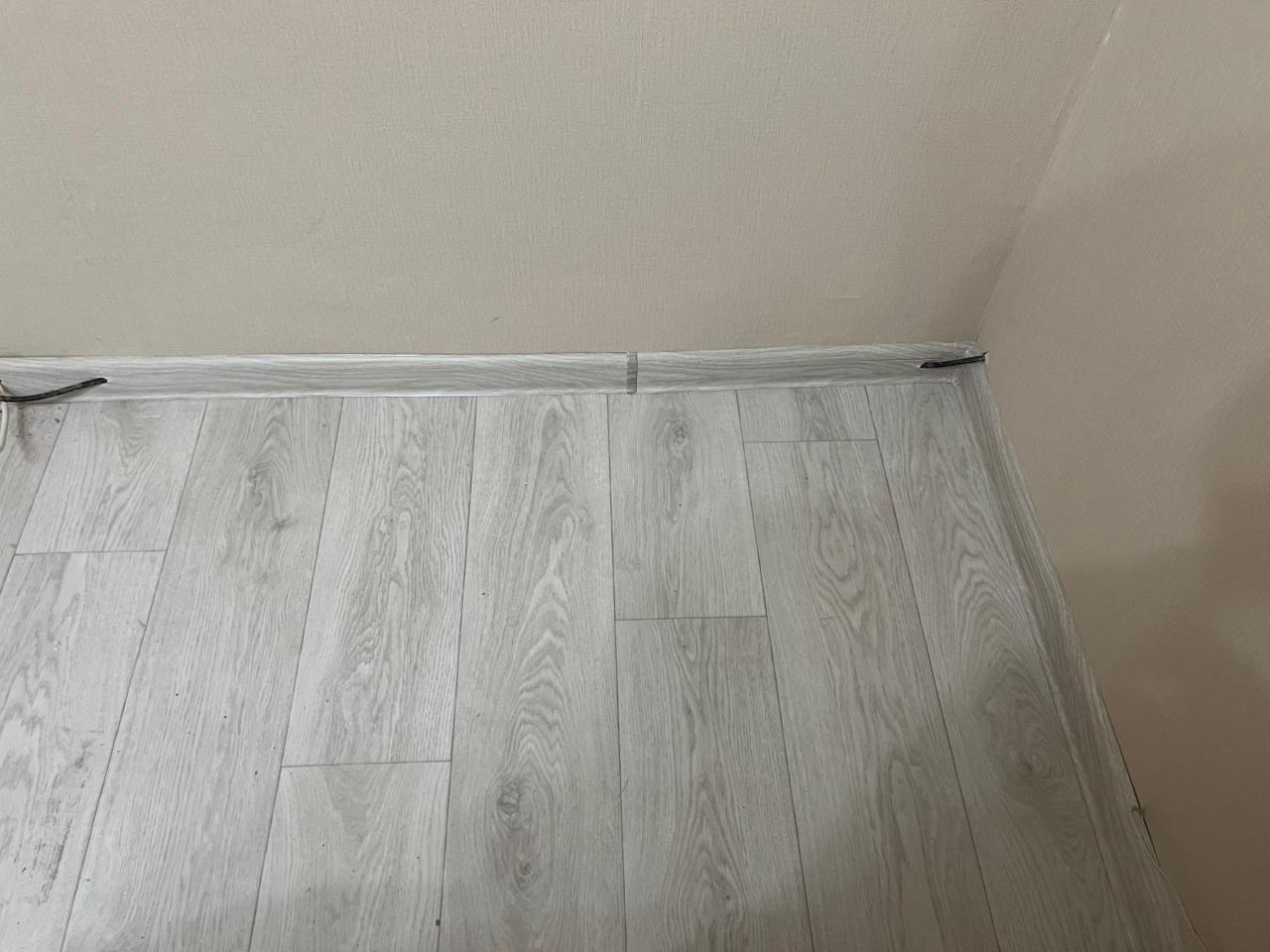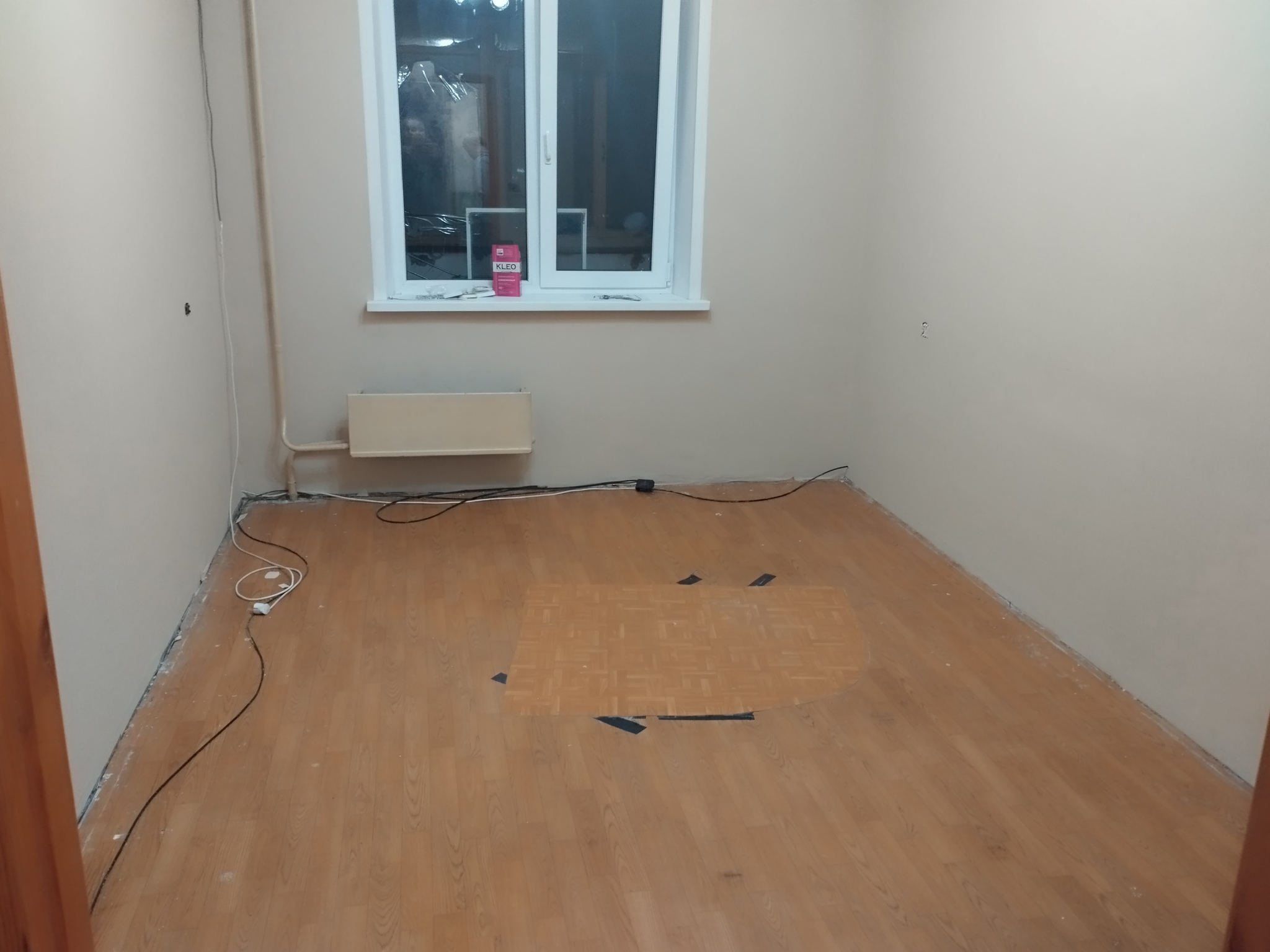Приехал опять вечером. Следующий этап работа с полом. Так как я заранее оторвал плинтуса, теперь спокойно не задевая новые обои сворачиваю старый линолеум.