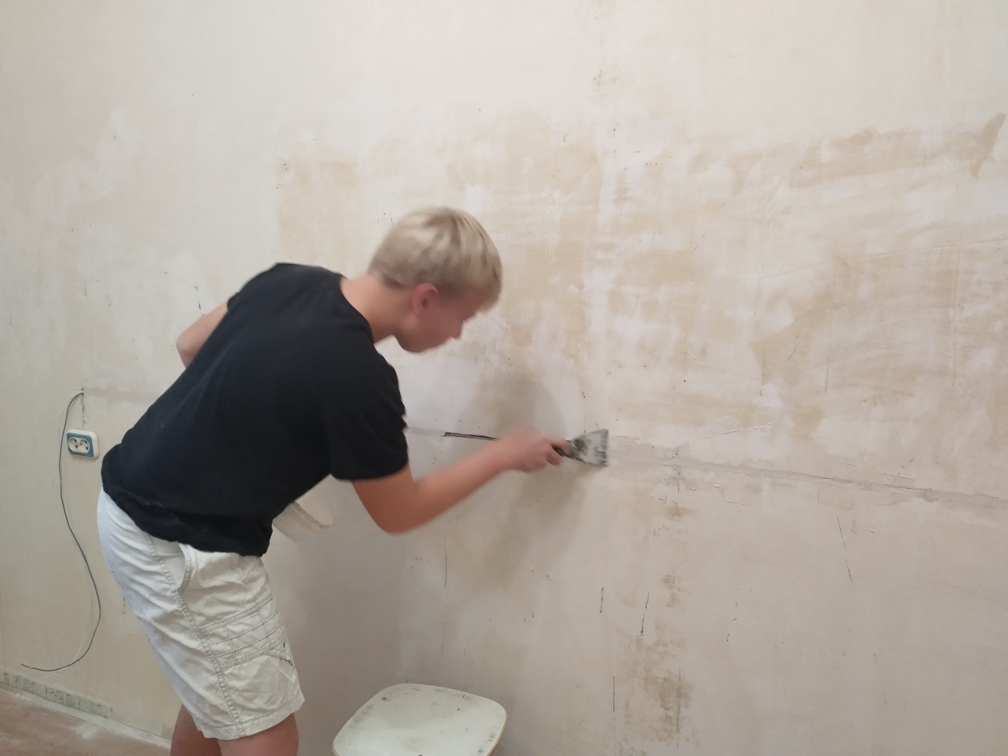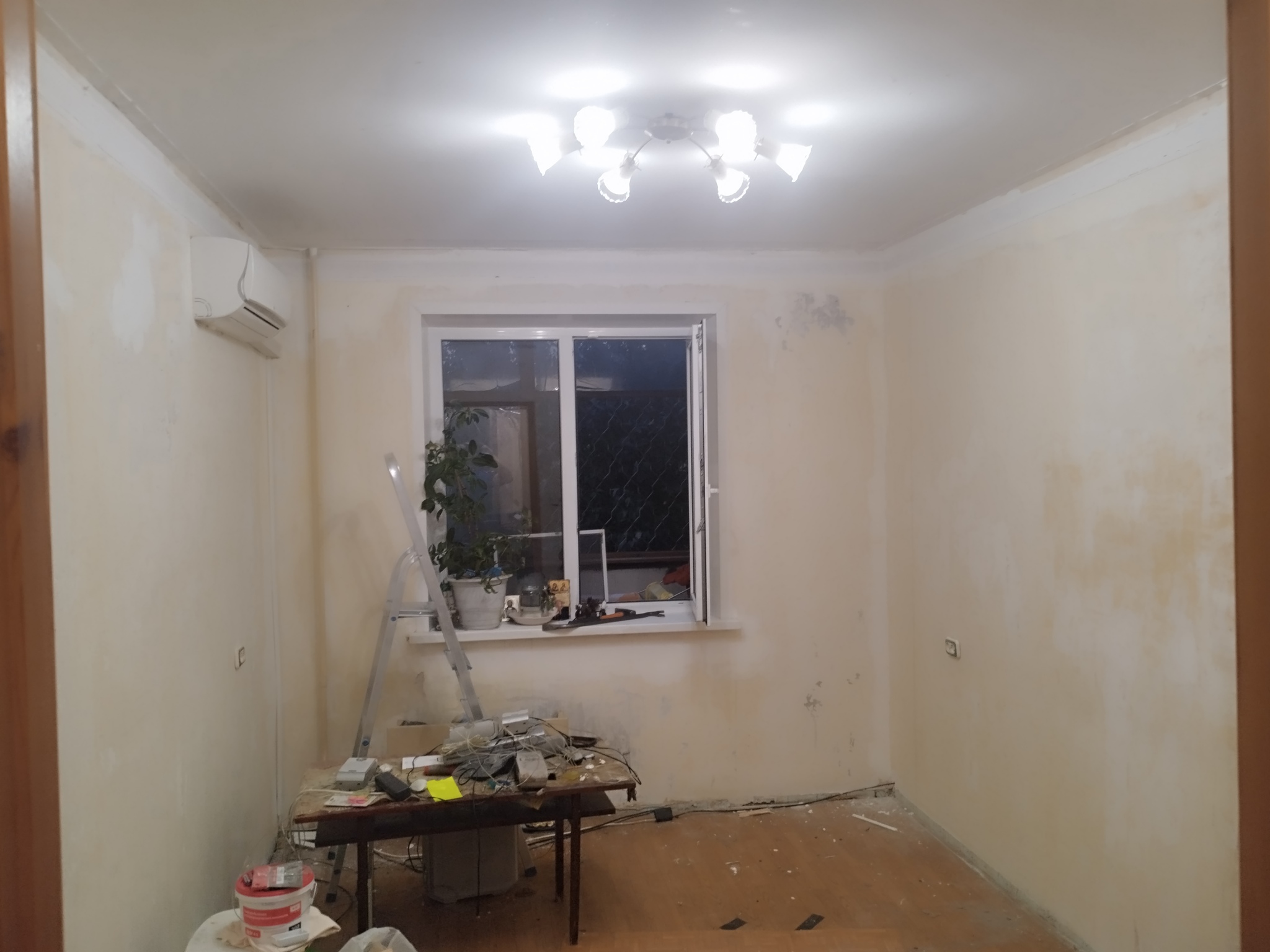 Следующий рабочий вечер. На фото выше видно серые пятна, это места где отвалилась шпаклёвка и просвечивается цементная плита. Сегодня буду шпаклевать.
