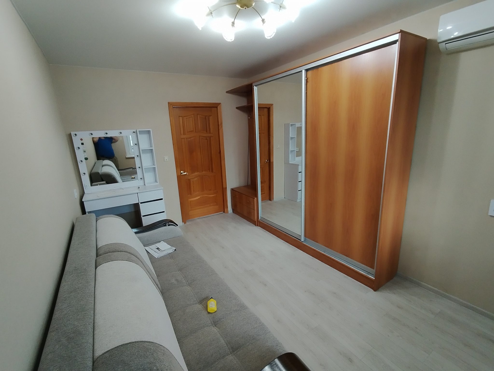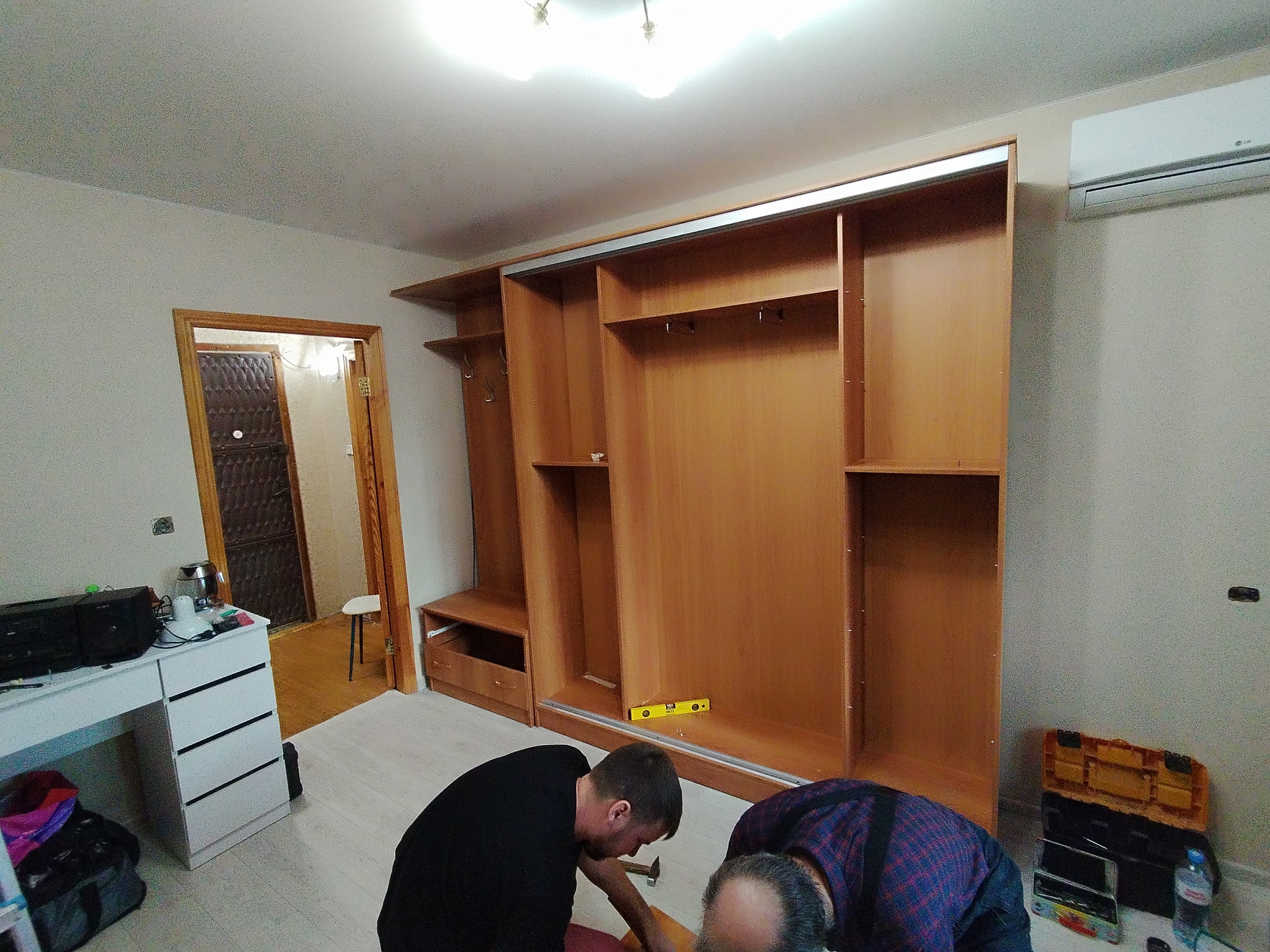 Я приехал очередной раз, мастера устанавливают шкаф купе. Я смотрю и учусь. Обратите внимание у шкафа слева полки и вешалка быстрого доступа. Очень продуманно, а то у всех стулья работают вешалками.