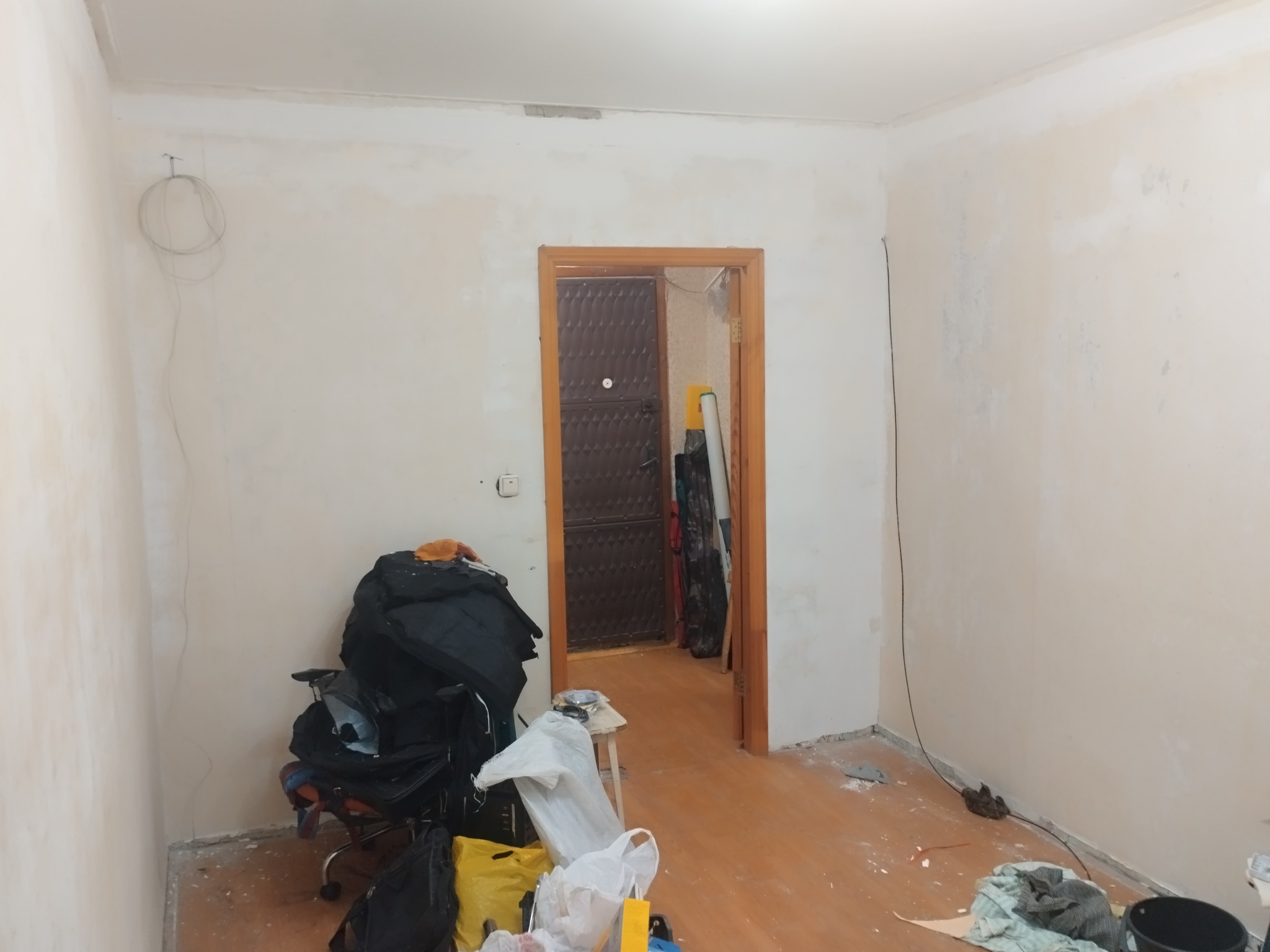 На первой фотографии комната из который уже вынесли часть мебели, старый диван-кровать который стоял справа, книжный шкаф был расположен в левом от входа углу, старое потёртое кресло. Мы с сыном разобрали корпусную мебель на отдельные доски, диван вынесли до нас вся мебель отправилось на помойку. В левом углу стоит телевизор soni, ему лет двадцать. Кинескоп сел, ремонт нецелесообразен. Телевизор также ушёл на мусорку.