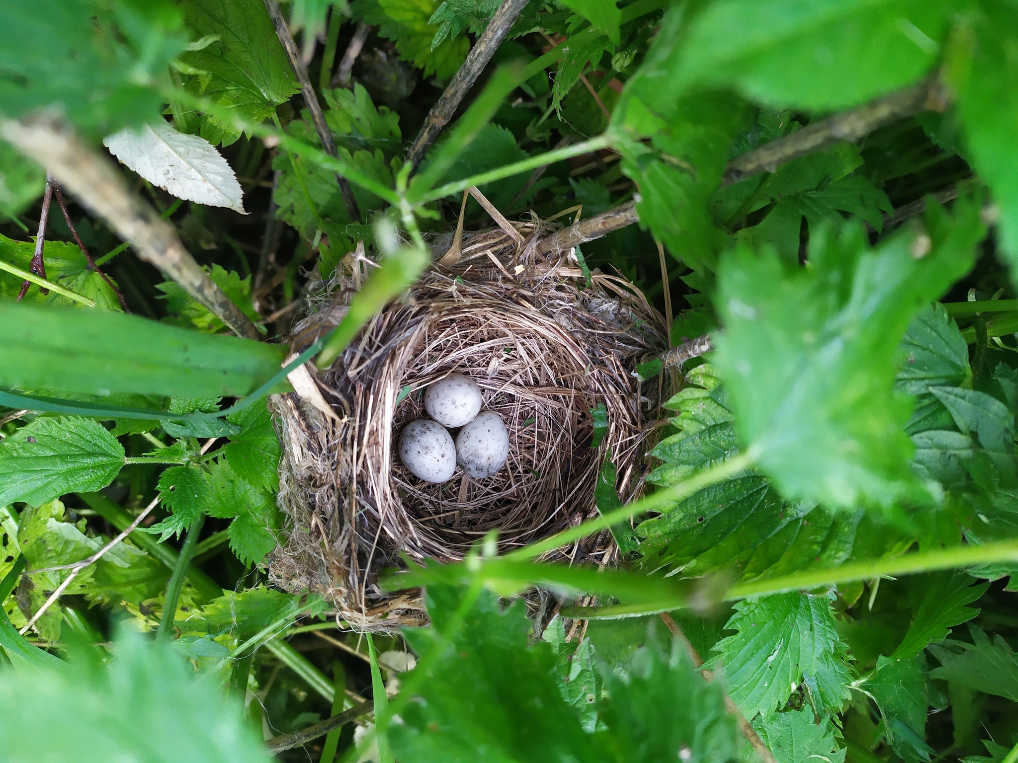 Приехал тут на дачу, и решил покосить траву наросшую за месяц. В гуще крапивы каким то чудом в последний момент увидел гнездышко, а в нем лежало три яичка. Решил не трогать этот участок травы, и оставил его в неприкосновенности. Боялся что птица испугается смены обстановки и улетит, но! На следующий день там было уже 4 яйца, а вот сегодня уже 5! Сегодня я все же первый раз смог застать маманю в гнезде, но сфотать не успел, ибо она сразу подорвалась на лыжи. Птичка размером в половину больше воробья(может с двух), песочного цвета с длинным клювом. Может кто нибудь сможет по яйцам и описанию подсказать что за птиц, уж очень интересно узнать что за сосед у меня завелся.