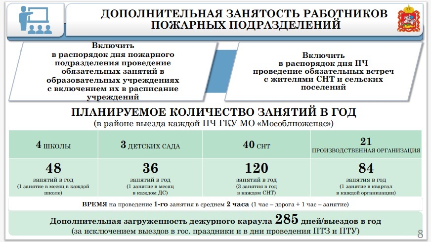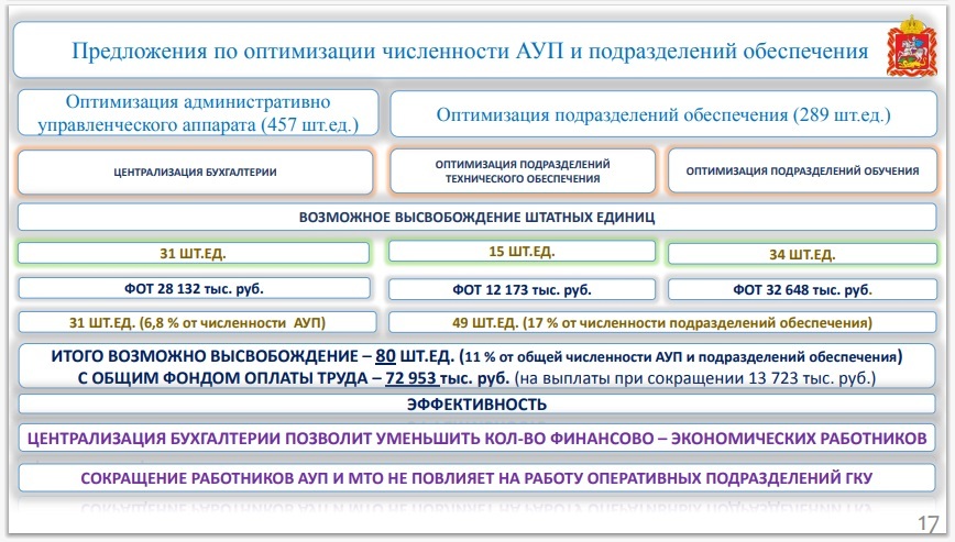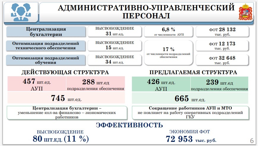 В 2021 году в связи с оптимизацией ГУ «Мособлпожспас» планирует сокращения 445 человек в том числе пожарных, диспетчеров пожарных частей и водителей пожарных автомобилей.