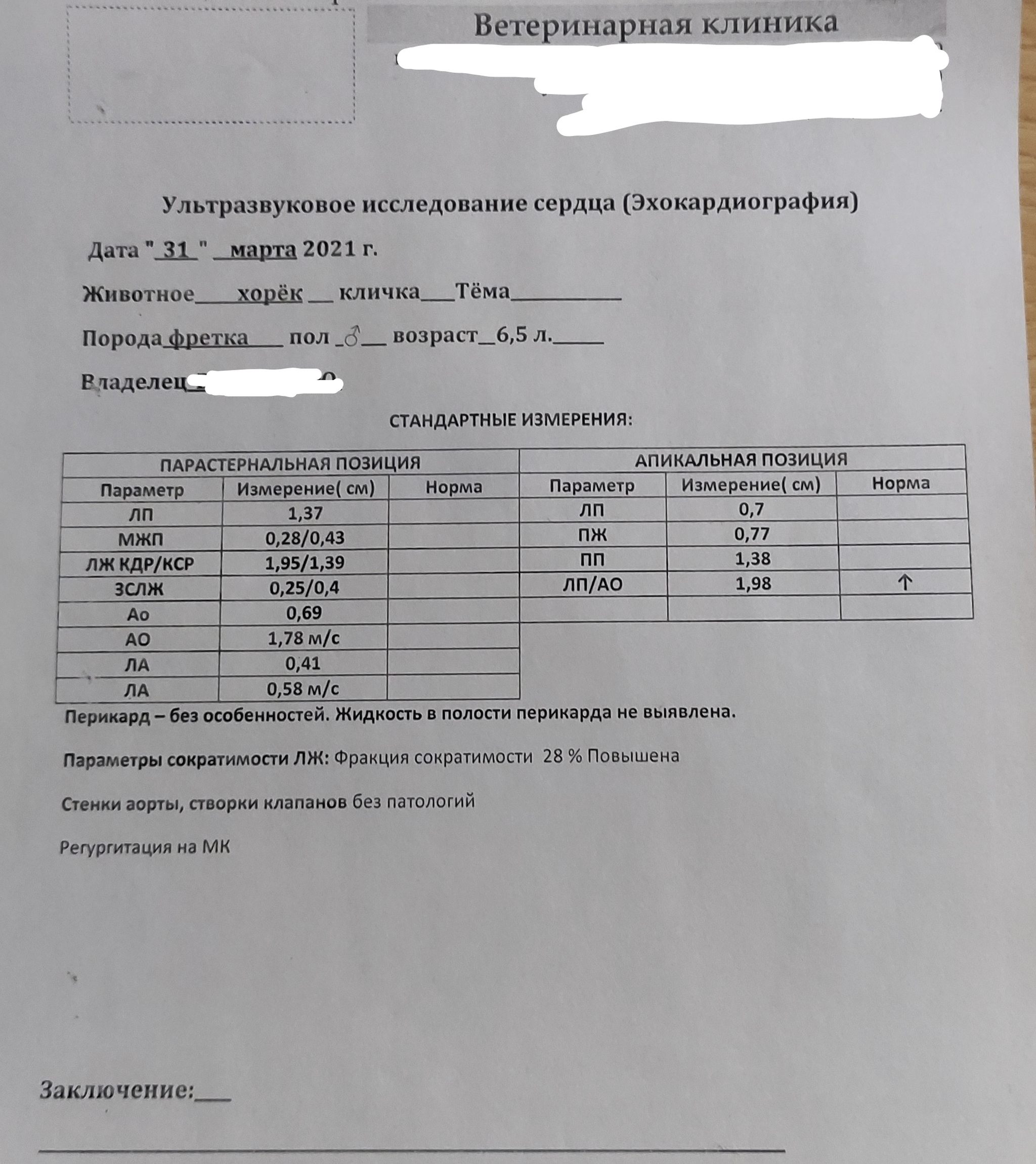 Но тут беда! В Тюмени нет ветеринаров, которые знают стандарты сердечных показателей хорьков! УЗИ сердца сделали, а показателей "по нормам" заполнить не могут по незнанию. Очень нужен кардиолог, который онлайн нам заполнит недостающие показатели по УЗИ. Естественно, что не на добровольных началах. Ехать из Тюмени куда-то далеко нет возможности для личной встречи.