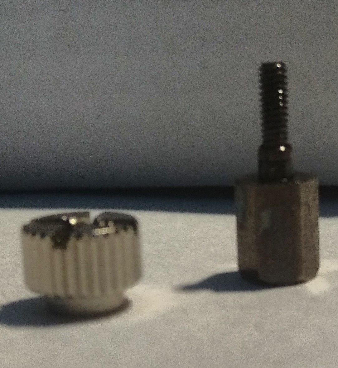 Закручивал вроде не сильно, но болт лопнул. На фото - такие же целые (болт и гайка?) В инструкции было написано их название - Bracket Standoff и T-nut, понятно что по такому наименованию ничего не найдешь, но я уже перерыл много страниц АлиЭкспресс, так ничего и не нашел. Их диаметр чуть больше миллиметра, подойдут и на 2мм