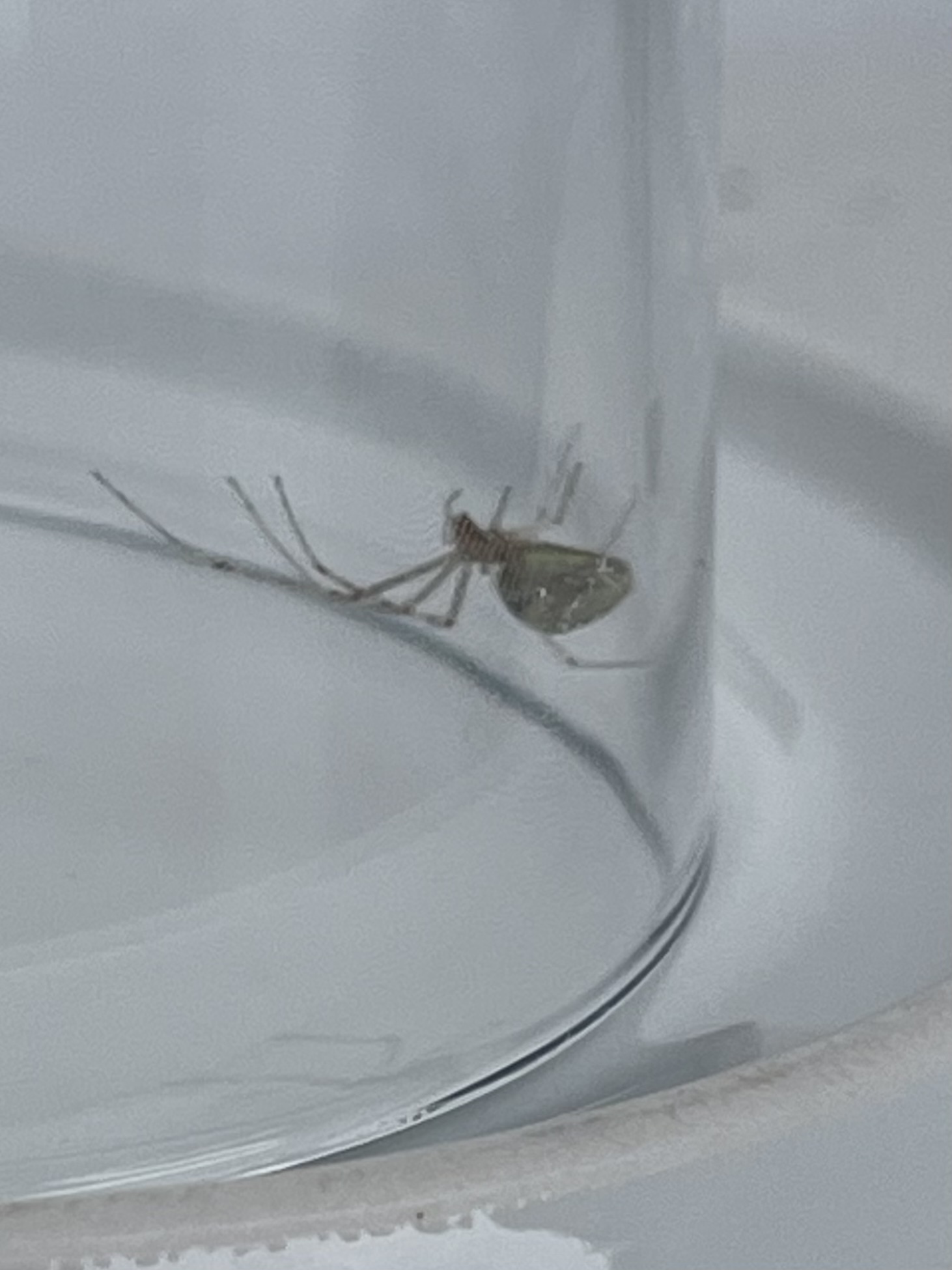 Здравствуйте! Нашла у себя такого малыша. Прихлопывать не хочется, но и страшновато, никак не пойму, что за зверь, в жизни таких паучков не видела. Помогите, что это за вид? Нормально сфотографировать не удалось, поэтому сделала вот такой набросок. Больше всего по строению он мне напоминает сенокосца, но лапки не такие длинные, и паутину плетёт