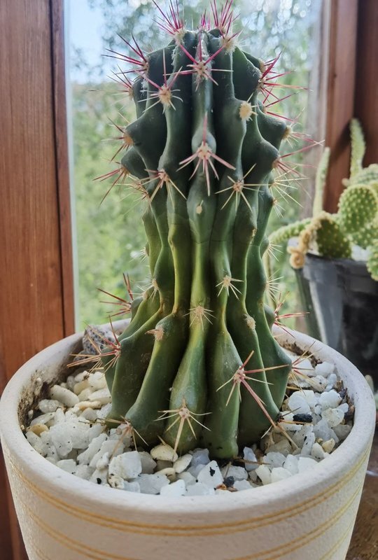 Первый - один из самых старых кактусов в моей 'коллекции'. Увы, жизнь его побила - по-первости пережил одну зимовку при активном поливе и слабом освещении, сильно вытянулся. Потом я создал ему условия получше, и форма из груши превратилась в гантель. Может, получится его определить хотя бы до рода?