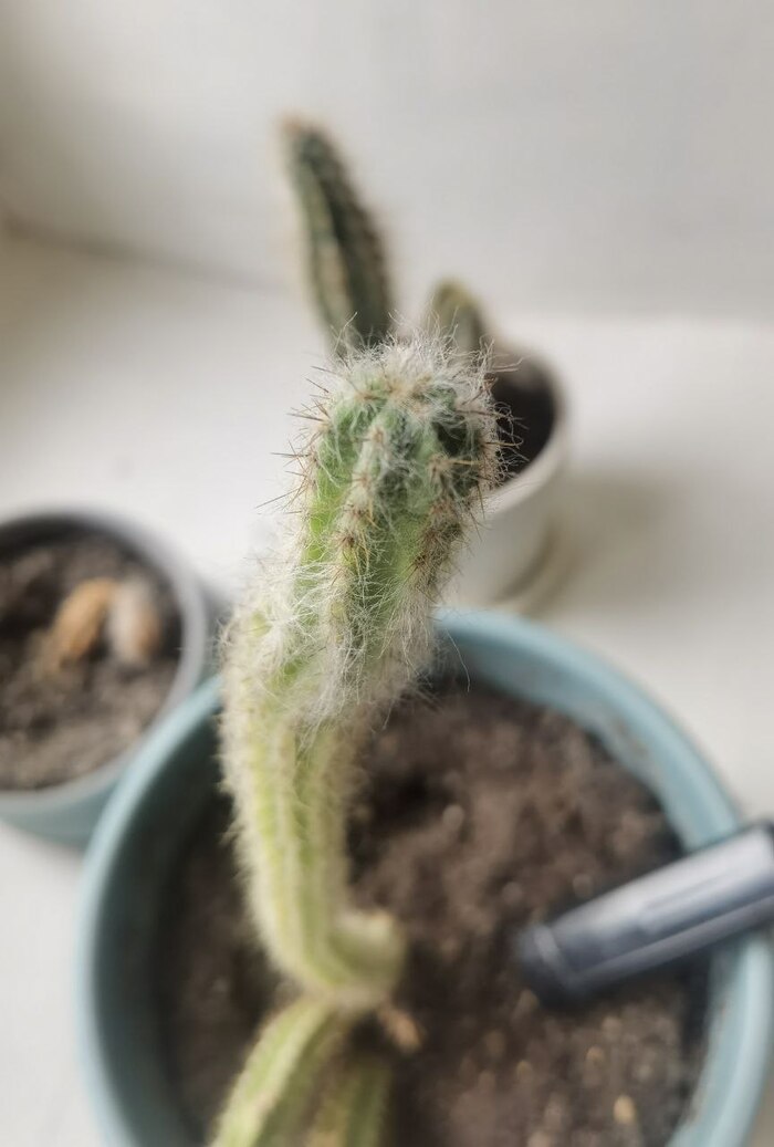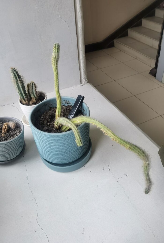 Ну и последний вопрос - вот этот заморыш. Растёт в подъезде, отрезал от него загибающийся побег на укоренение (как раз он на укоренении соседствует с первый "эхинопсисом" выше).