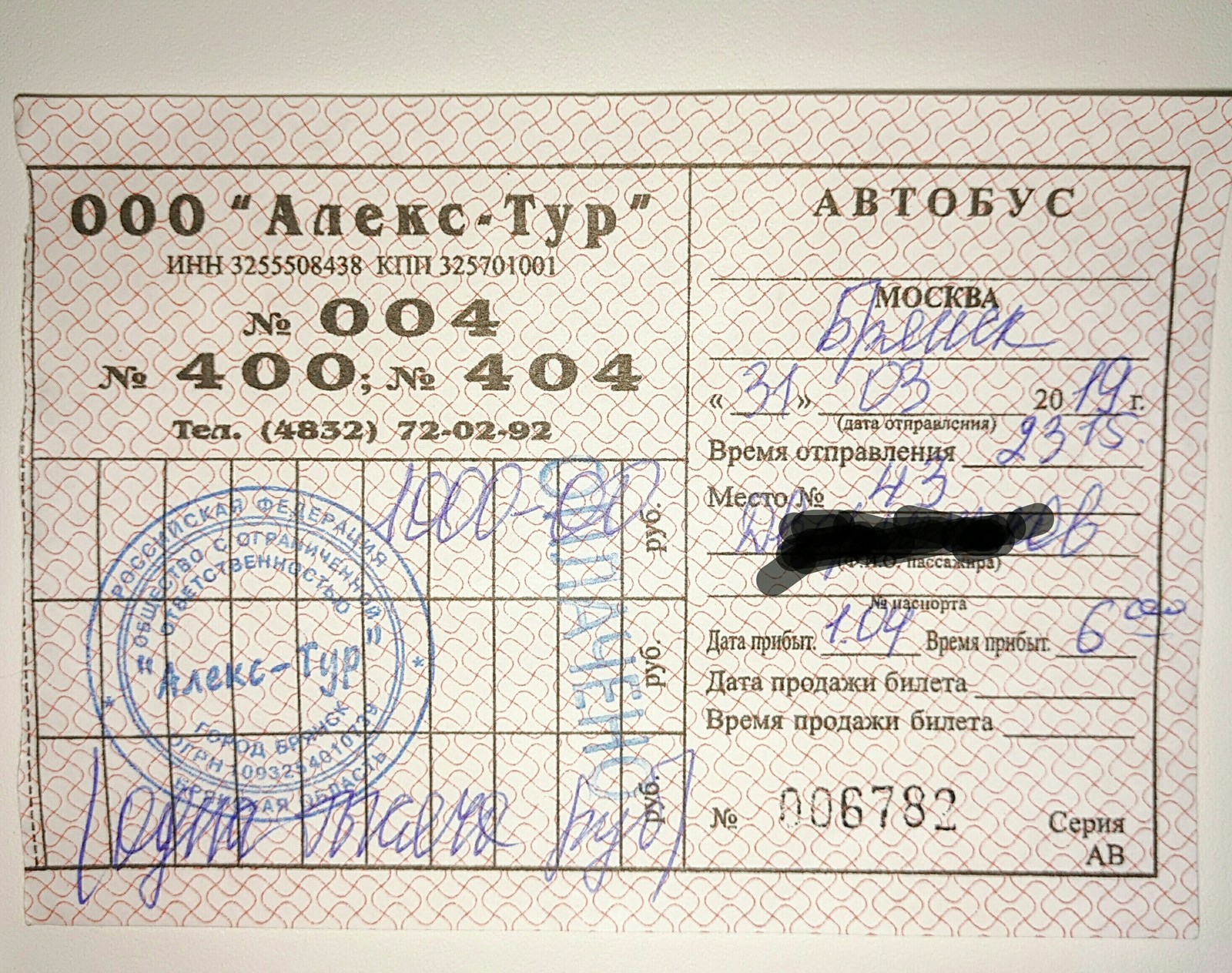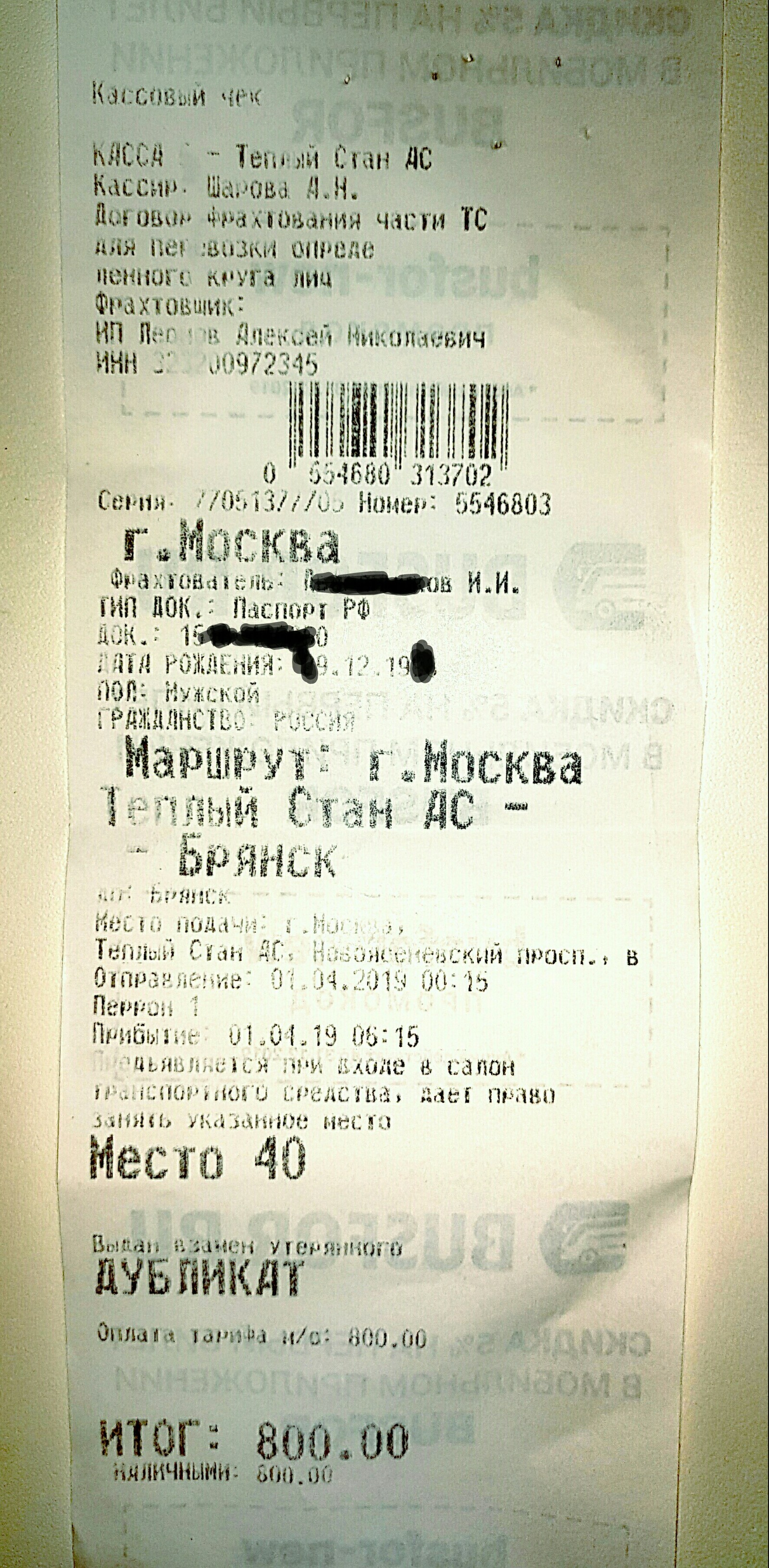 1 апреля я совершил поездку на автобусе по маршруту Москва - Брянск. Я езжу тем автобусом не первый год и до этой поездки я никогда не получал чеки подтверждающие факт оплаты проезда.