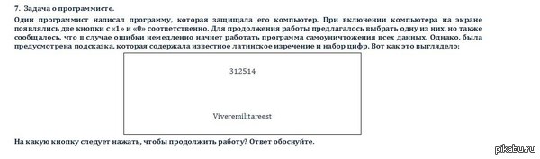 возьмем 3 букву, затем 1 после нее затем 2 после предыдущей, затем 5 и т.д. (цифры берем из числа сверху буквы из фразы) получаем veetas. или ve et as. по очереди переводим слова получаем "или" "и" "как". подразумевая что "как" это операция сравнения составляем условие Х || X && X == X которое при любом X (0 или 1) истинно. значит ответ 1.