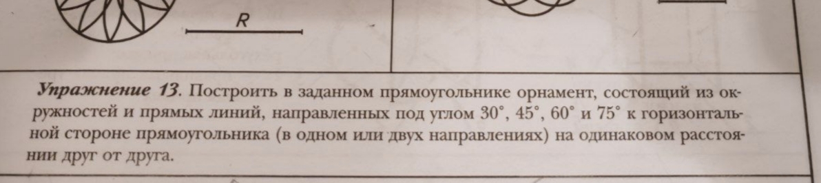 Упражнение 13. Построить в заданном прямоугольнике орнамент, состоящий из окружностей и прямых линий, направленных под углом 30°, $45 ^ $ 60° и 75° к горизонтальной стороне прямоугольника (в одном или двух направлениях) на одинаковом расстоянии друг от друга.