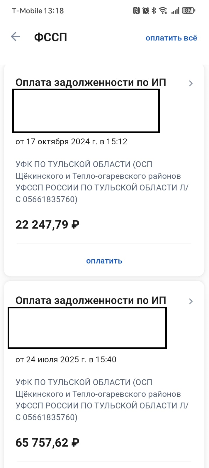 Если коротко: был долг на 65 000 рублей. Я его оплатил на 41 000 рублей. Далее мне выносят хуеву тьму постановлений о взыскании на 18 000 рублей + 4000 и 65 000 рублей. Я пошёл на мировую с агентством по взысканию долгов, и оплатил долг напрямую 12 августа со скидкой, предоставив в ФССП справку об отсутствии задолженности. 27 июля направлял судебным приставам два обращения о том, что сумма взыскания не верна, и не может составлять 88 000 рублей (включая исполнительный сбор в размере 4000). Им похуй. Заявления зарегестрированы, реакции никакой. Звонки бесполезны, трубки никто не берёт. Ехать из Москвы в Тульскую обл. - крайне напряжно, да и нет оригиналов документов на руках, только копии, которые могу распечатать, и оригиналы на почте. Все постановления и справки готов предоставить, если оставите какой-либо контакт под любым моим постом. С удовольствием бы обратился на то же самое профиру, только на кармане хуй с маслом, 1700 рублей до конца месяца. Если есть кто-нибудь, кто готов помочь за "спасибо", нищеёбу, вроде меня, буду безмерно признателен.